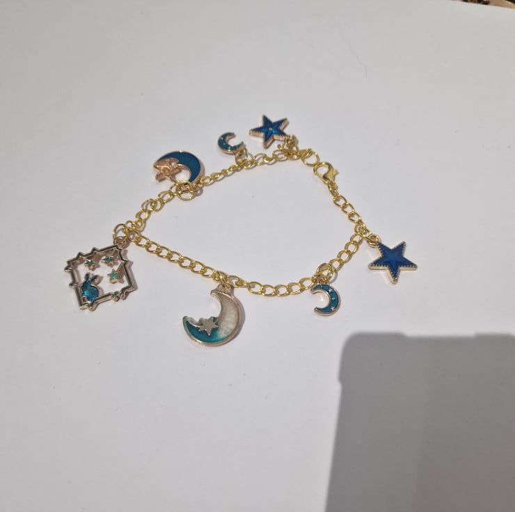 Bunny charm gold bracelet in a sky theme in gold with blue enamel. The bracelet has moon, star and a bunny charms on it. Charms are made from a zinc alloy lightweight sturdy and do not fade easy. All charms are secured via jump rings on a gold plated chain. Bracelet has a gold plated lobster closure.