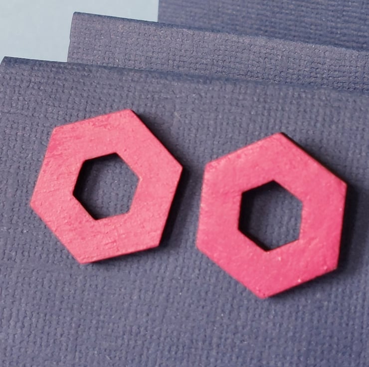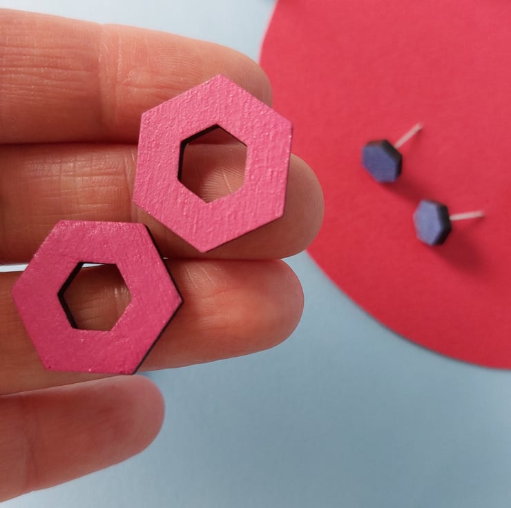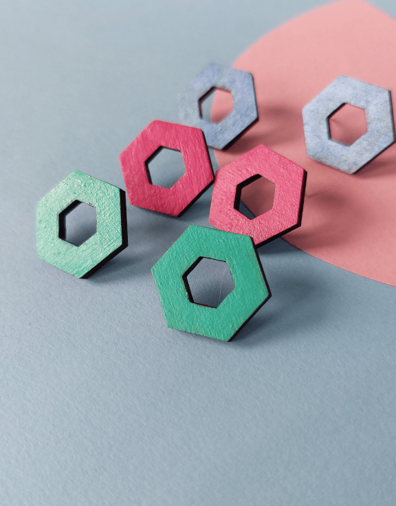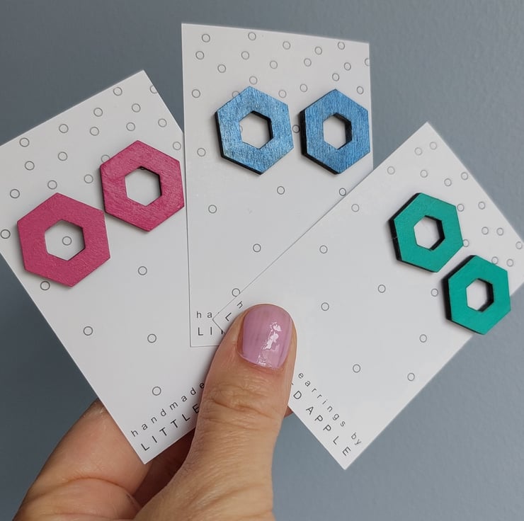 These stud earrings are an open hexagon shape, hand painted in plain bright colours to bring a cheerful touch of fun to your outfit.
