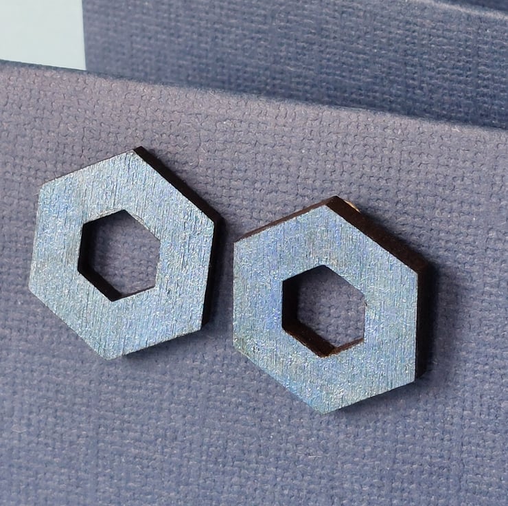 The hexagon shape has a diameter of 23mm at it's widest part and the wood is 3mm thick. The edges are darker as they are caramelised by the laser cutting process and this contrasts nicely with the painted colours.