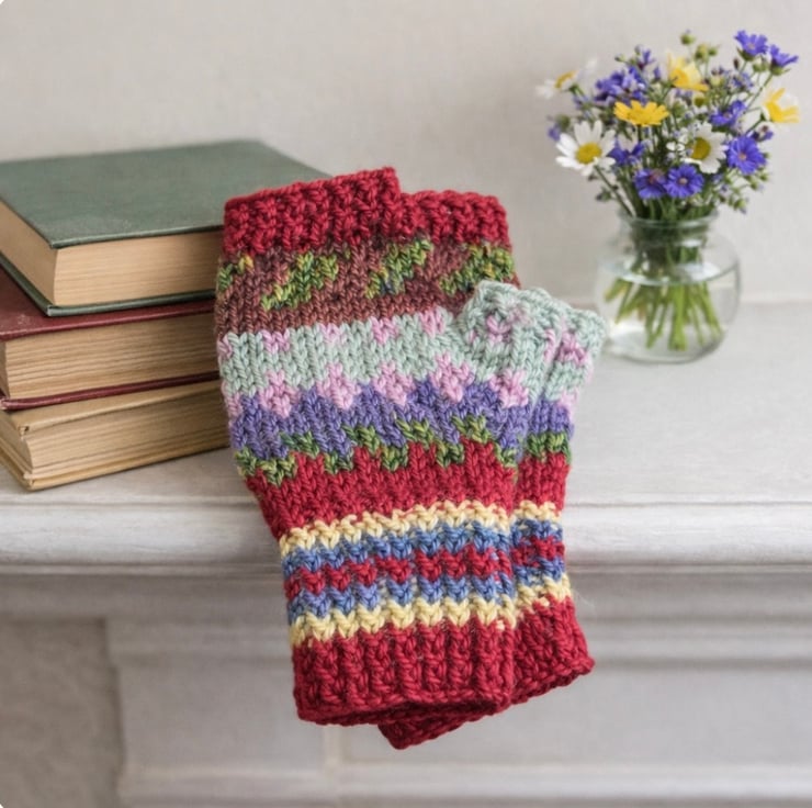 My inspiration for my hand knitted fingerless gloves are the many hand knitted accessories created by my mum for my siblings and I when we were young growing up in the cold winters in East Anglia, alongside my general love of vintage hand knitted garments. My colours come from the flowers and trees in my garden and the natural world around me.