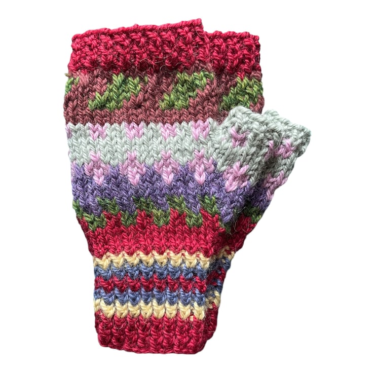 These hand knitted colourful fingerless gloves are created using an Aran weight Wool & Alpaca yarn. They are an adult size measuring 19cm from the top to the bottom of the fingerless gloves and measure 11.5cm across the palm area. Like all hand knitted garments there is some stretch in these fingerless gloves. Soft and warm they are ideal for cooler days whether you are walking your dog, enjoying the out doors or just walking to work, a perfect addition to your favourite accessories. Hand wash in a cool wash.
