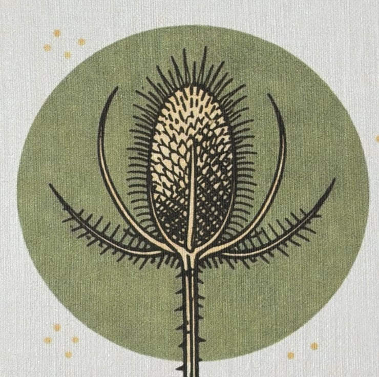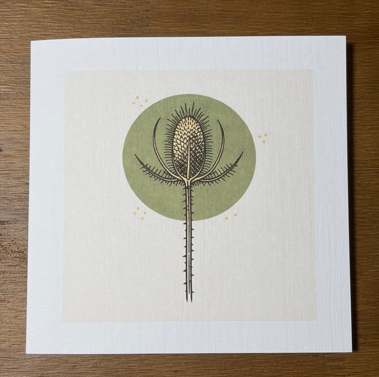 A striking botanical greeting card featuring a stylised teasel, illustrated in my signature woodcut / lino print style.