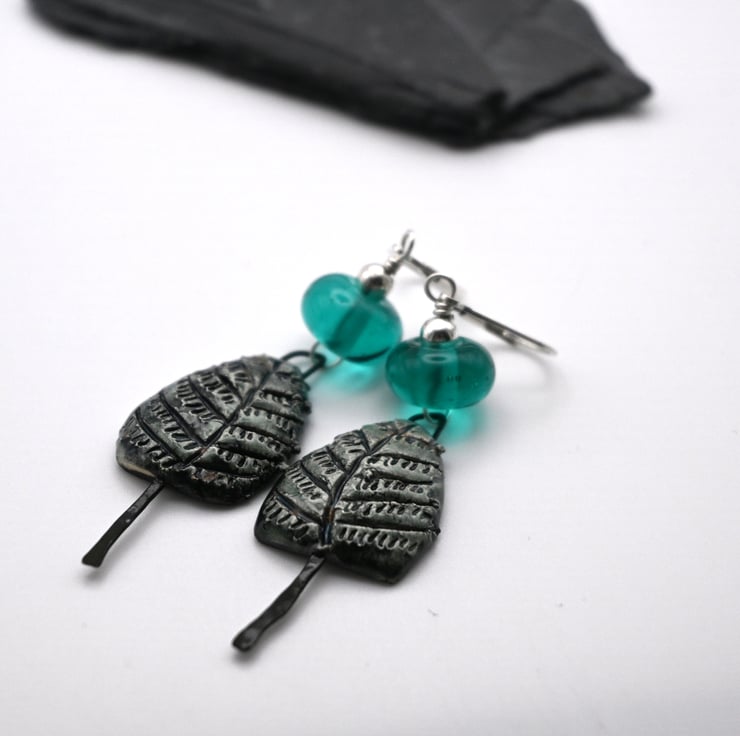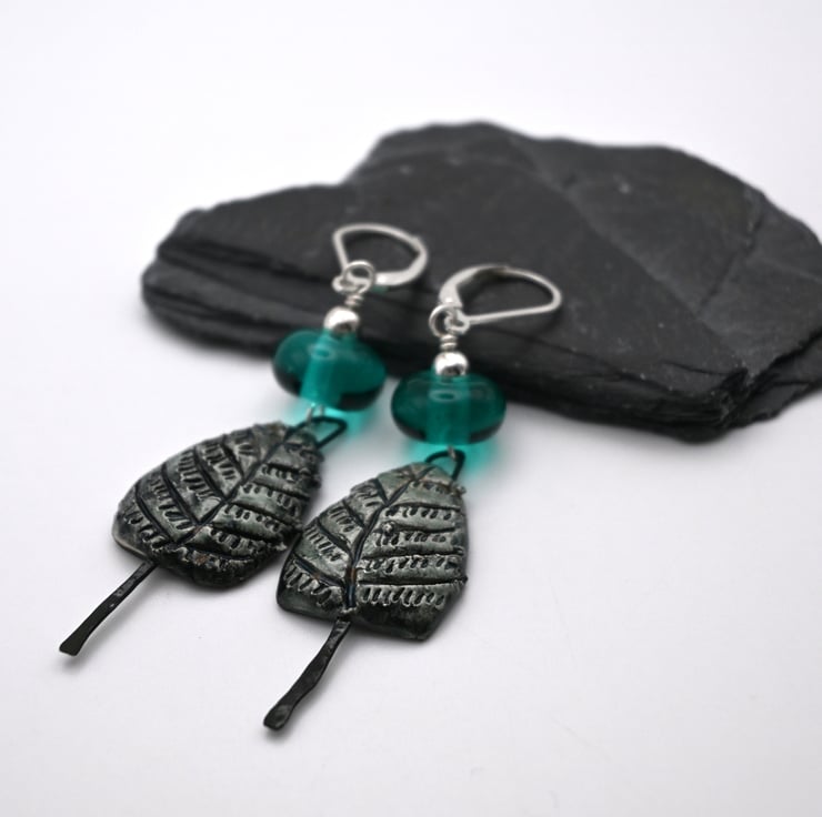 A pair of sterling silver lever back earrings made with handmade lampwork teal glass beads and handmade ceramic tree charms.