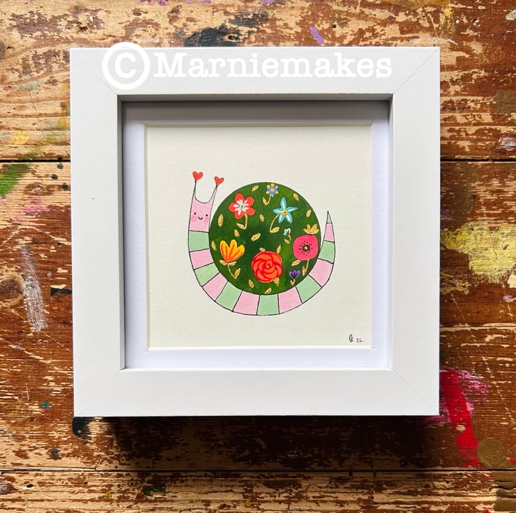 Sweet little original illustration finished in Gouache, measuring 7.5 x 7.5 cm , mounted and set in a simple white 10 x 10 cm frame, ready to pop straight on to your wall!