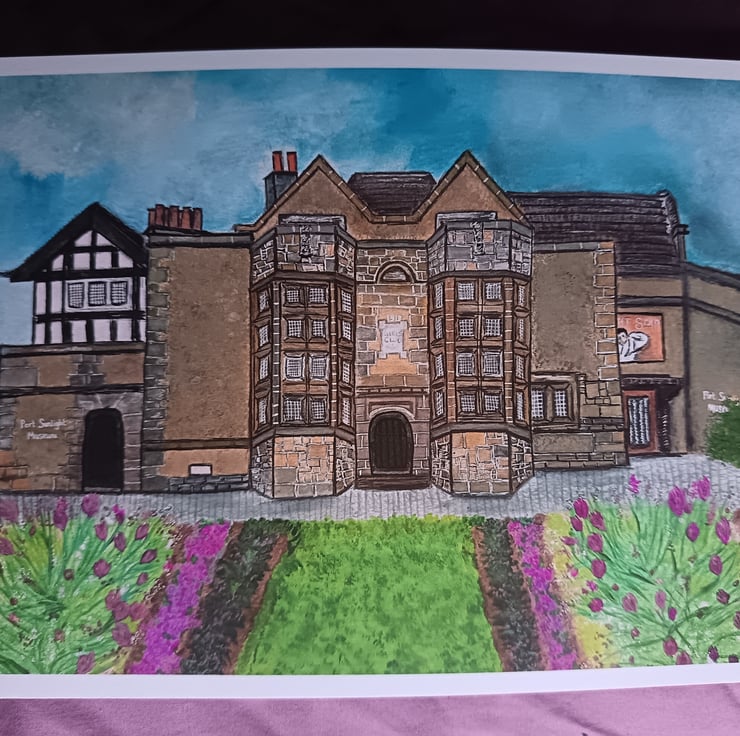 This is an A4 print on 300 gsm card, featuring my painting of Port Sunlight Museum on the Wirral. I completed the original piece using mixed media: acrylic paint, water soluble wax pastels and various pens, pencils and markers.