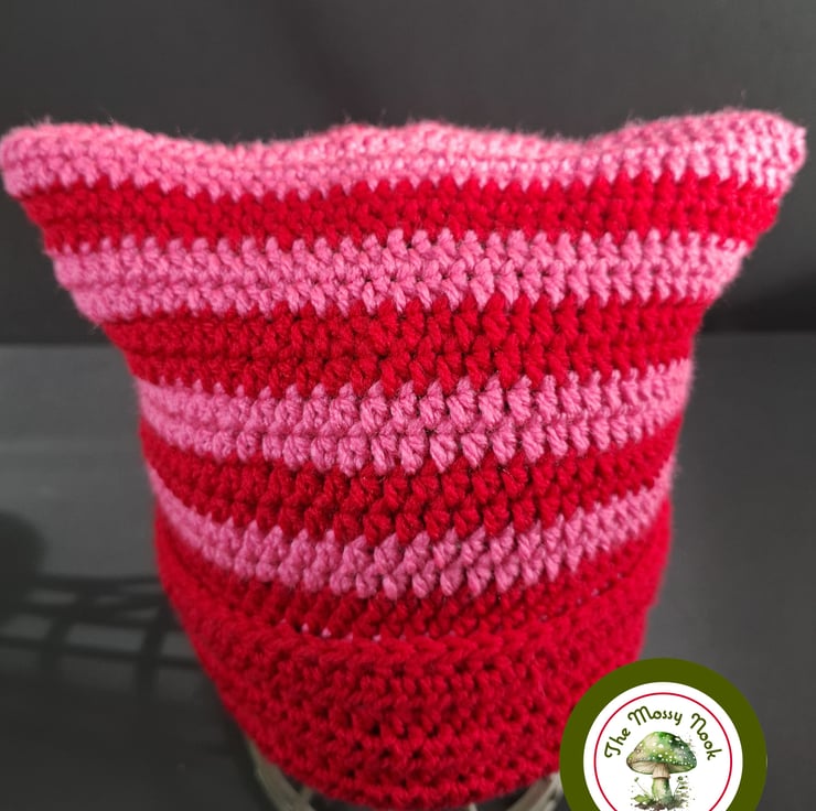 This cute cat ear hat is hand crocheted using a lovely soft, acrylic yarn in stipes of red and pink. The cuff is not fixed, allowing you to shorten or lengthen the hat to your choosing
