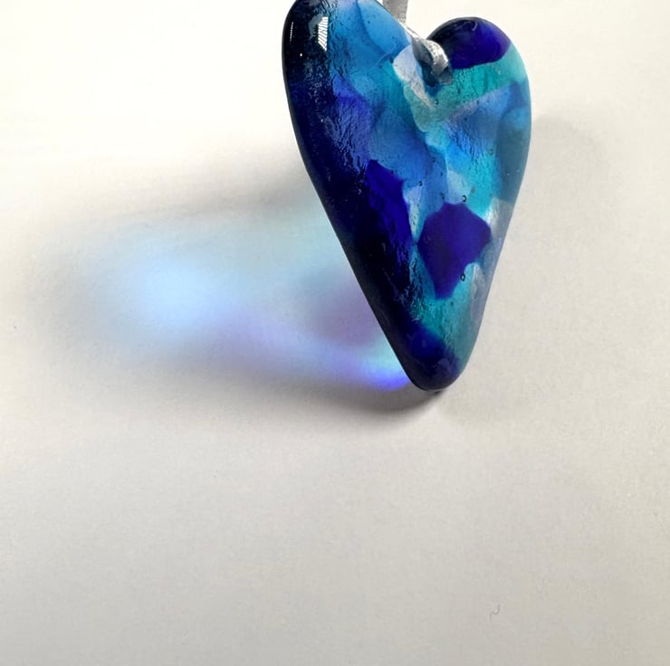 Stunning fused glass hanging heart in shades of blue . Each is totally unique and makes a wonderful gift . The approximate dimensions are 2 in x3 in