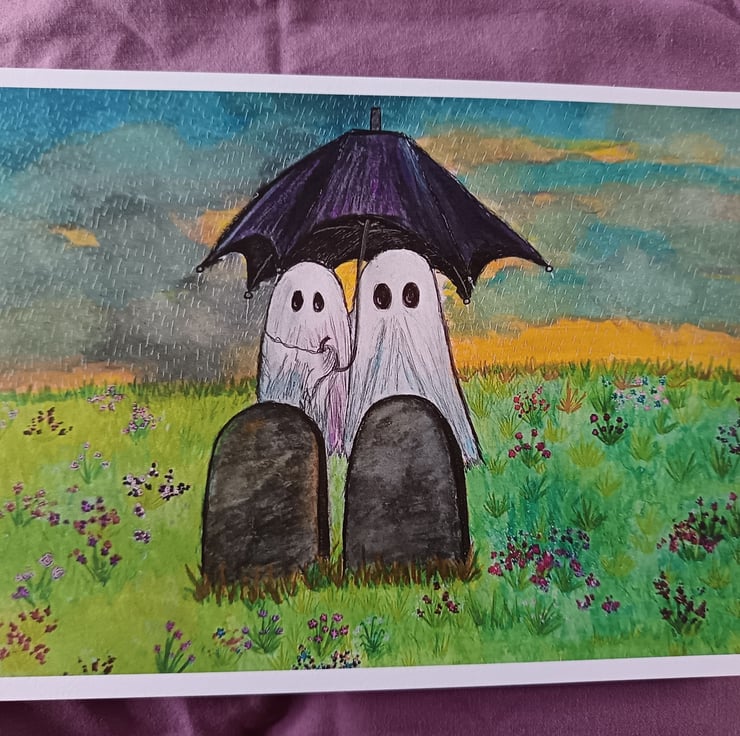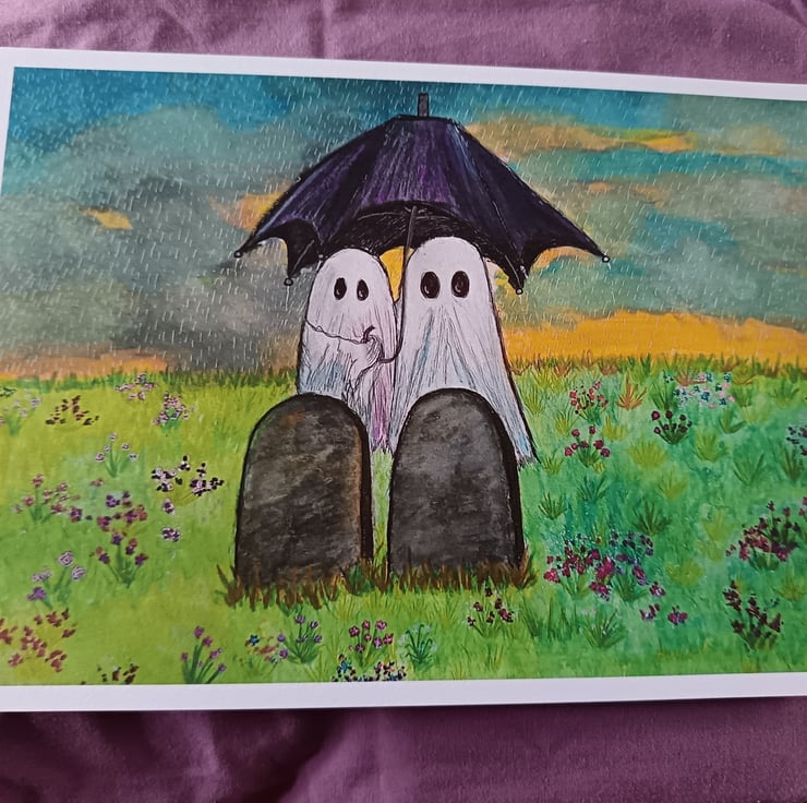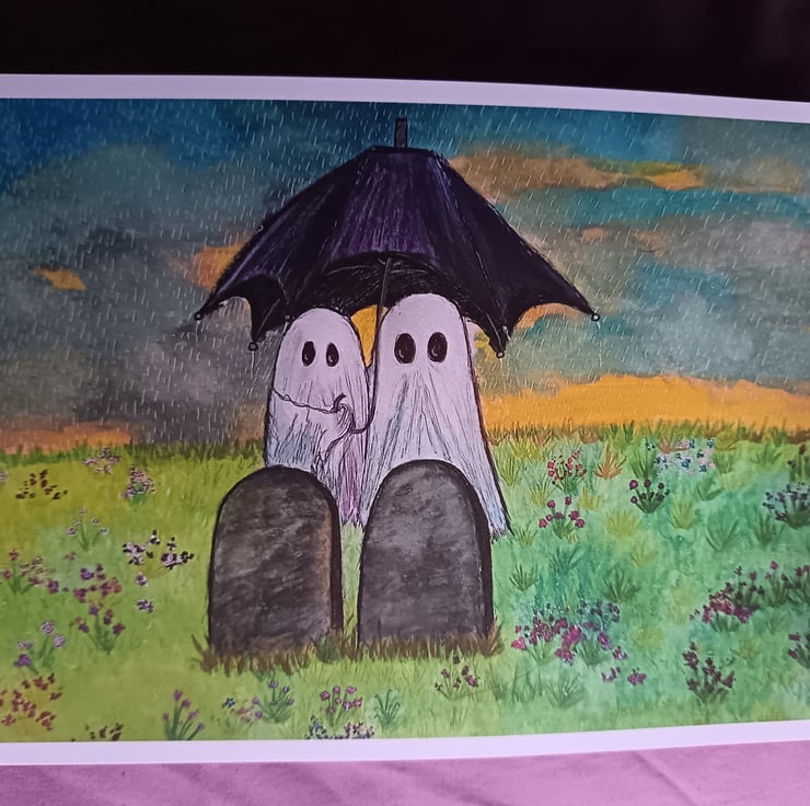 Leaning into a whimsical, spooky cute style, the scene depicts a ghost couple visiting their graves to reminisce, huddled romantically together on a rainy spring day beneath an umbrella.