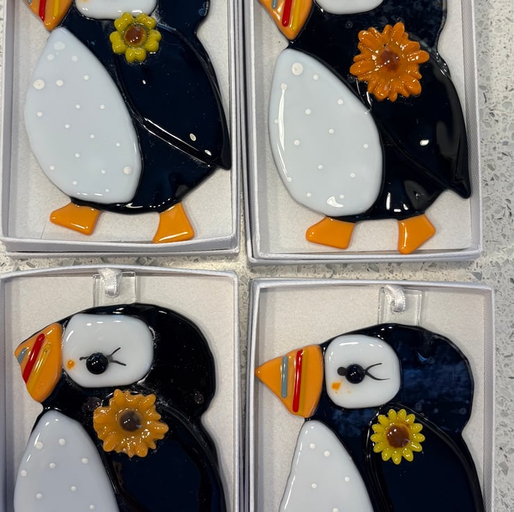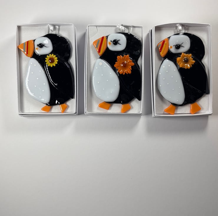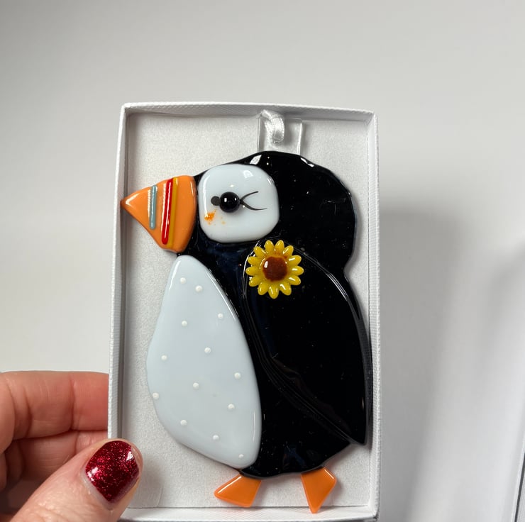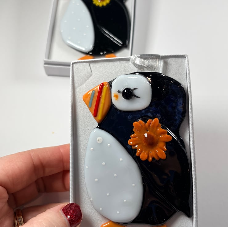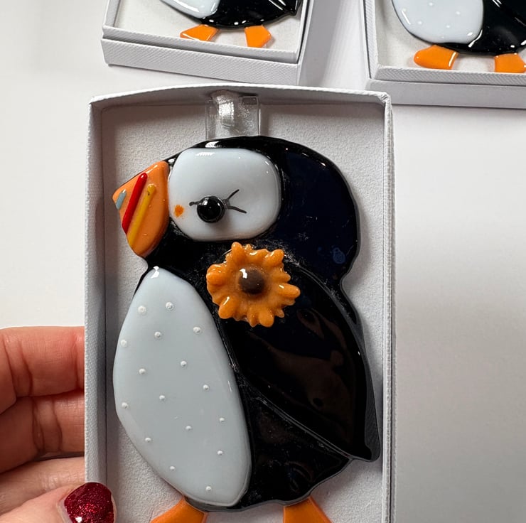 Each puffin has his own personality and please feel free to message me if you’d like a particular one . Each puffin is lovingly hand cut from sheet glass and fired x2 in my kiln . The glass is art glass so that they retain a beautiful shine . They are then drilled and strung with white satin ribbon . Each puffin is approximately 4.5 inches and comes presented in a white gift box .