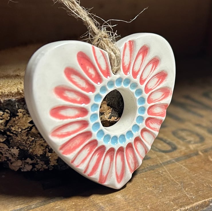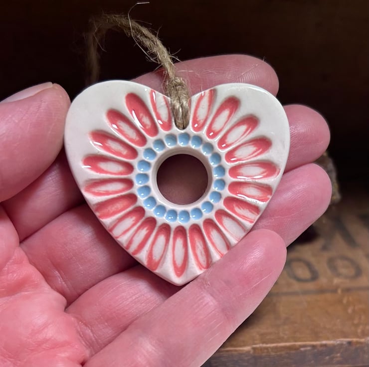 This heart is reduced because the prior and colouring are not perfect. This little heart is made from white earthenware clay and imprinted with a daisy design. It has been fired twice, once to the bisque stage and then a second firing for the clear glaze. It measures 4.5 centimetres wide x 4.5cm height x 5mm thick.