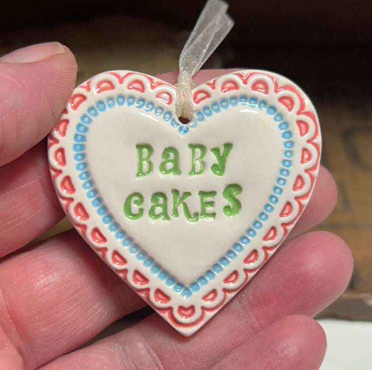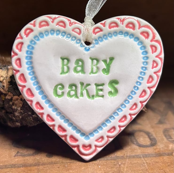 This heart is reduced because the writing is a bit wonky. This little heart is made from white earthenware clay, imprinted with the words Baby Cakes. The perfect gift to let someone know how much you love them! Some of the letters may be a bit higgledy piggledy but they have been stamped with love! It has been fired twice, once to the bisque stage and then a second firing for the clear glaze. It measures 4.5 centimetres wide x 5cm height x 5mm thick. It can be hung outside.