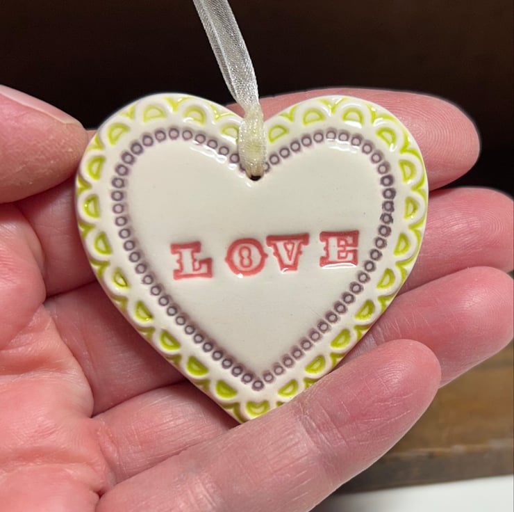 This heart is reduced because the text is a little wonky. This little heart is made from white earthenware clay, imprinted with the words LOVE. It has been fired twice, once to the bisque stage and then a second firing for the clear glaze. It measures 4.5 centimetres wide x 5cm height x 5mm thick. It can be hung outside.