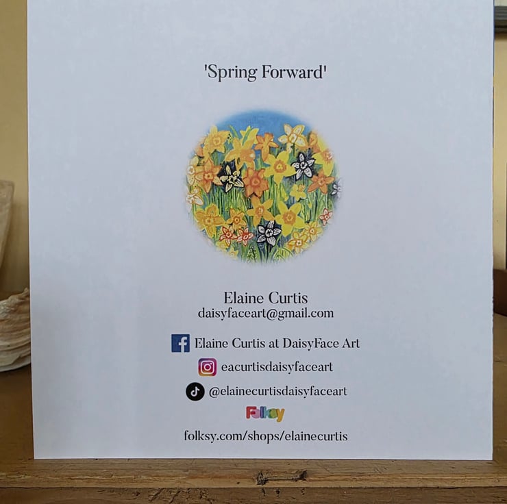 'Spring forward' is a bright and colourful design featuring daffodils. It is based on an original acrylic ink painting by Elaine Curtis.