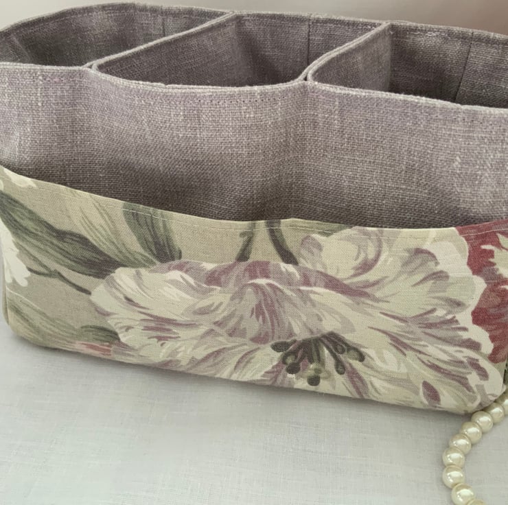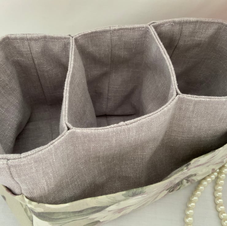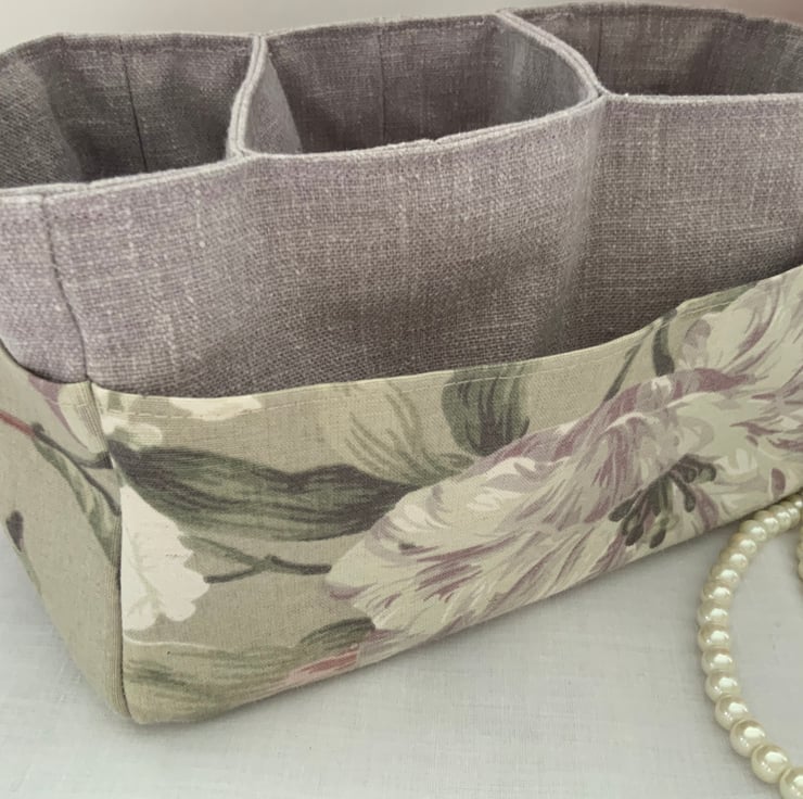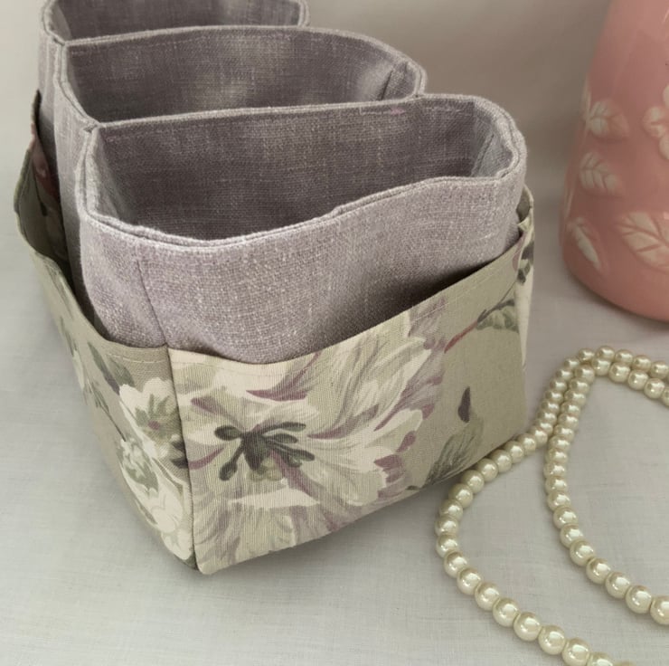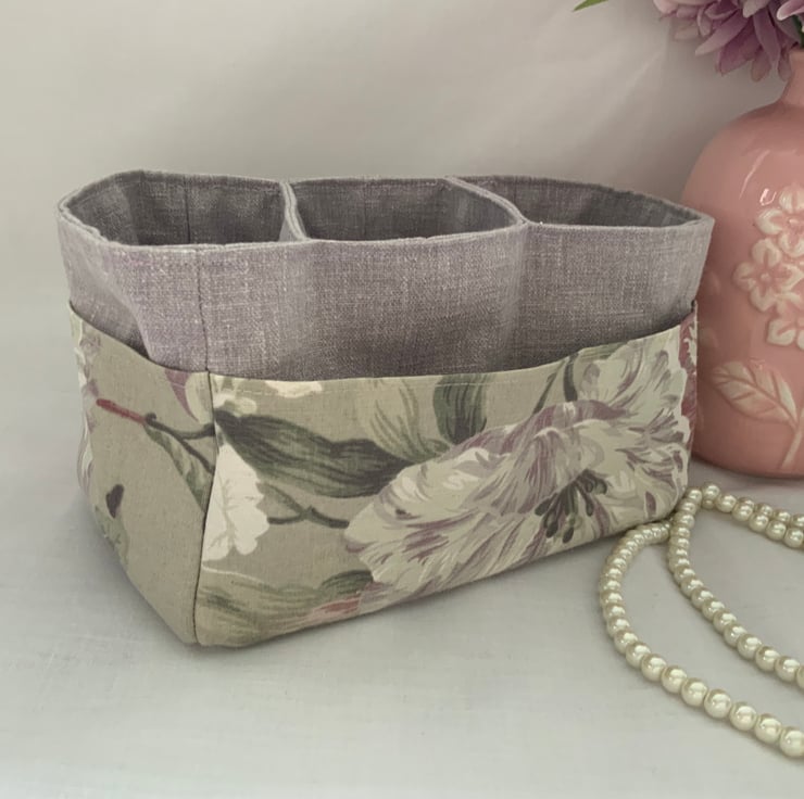 This useful fabric storage box has three useful pockets in the centre and additional outer side pockets too. A great storage box which can be used anywhere in the house and is perfect for keeping bits and bobs tidy. Useful for a craft room, desk tidy, dressing table storage.