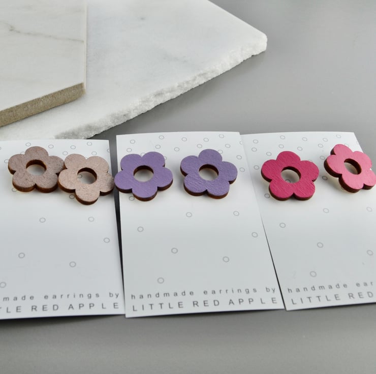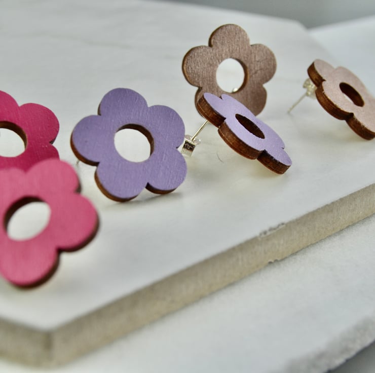 Sweet little stylised flower studs. These earrings are made from handpainted lasercut birch wood shapes. Inspired by 1960s flower power shapes, these studs are painted in a choice of metallic bronze, deep pink or lilac.