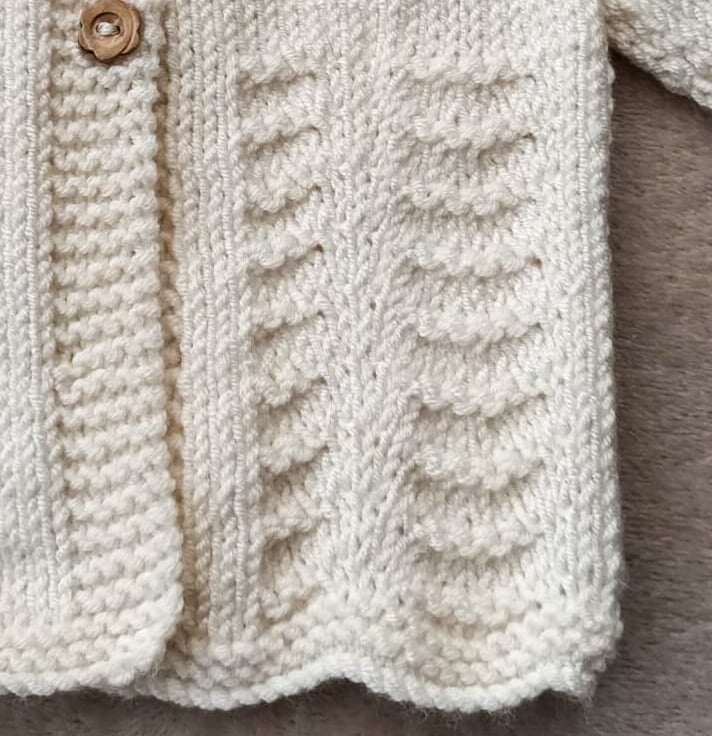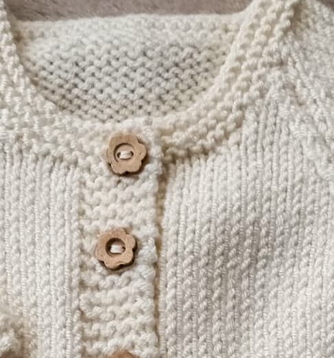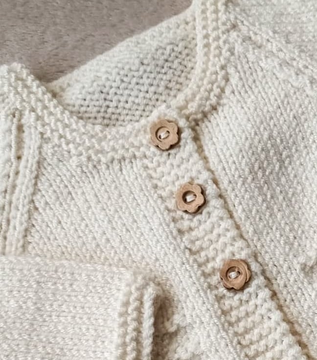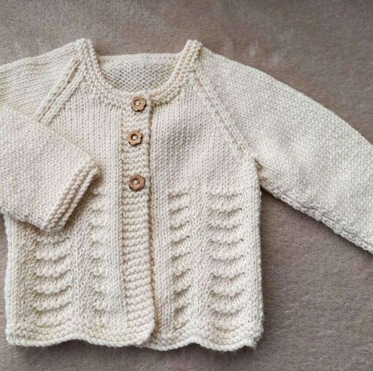 Newborn baby girls cardigan hand-knitted in a soft smooth cream baby yarn with a