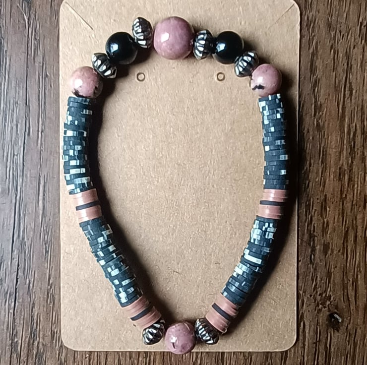 This listing is for "Mountain" - A single, one-off, stretchy, fashion bracelet made using black & white fleck and soft brown clay polymer beads, two black semi precious beads and four dusky pink and dark grey rhodonite beads.