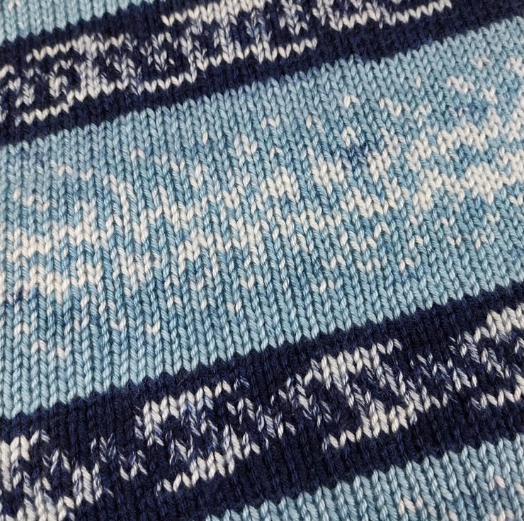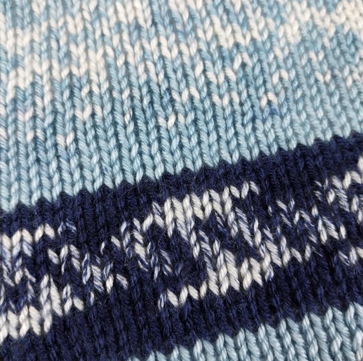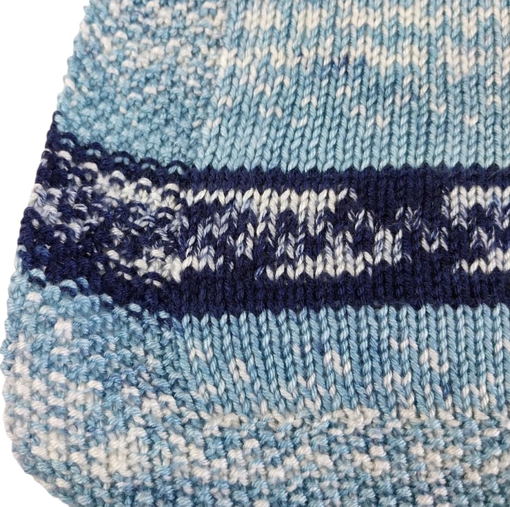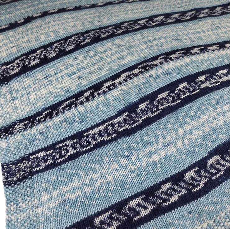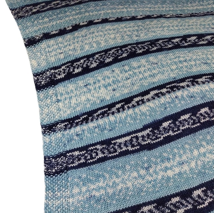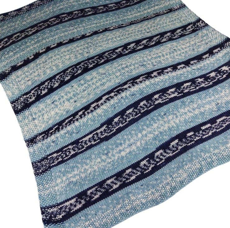 This hand knitted baby blanket is made with care and attention in every stitch. The soft blend of light and dark blue with creamy neutrals creates a calm, timeless look that suits any nursery and is perfect for a gender neutral gift.