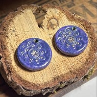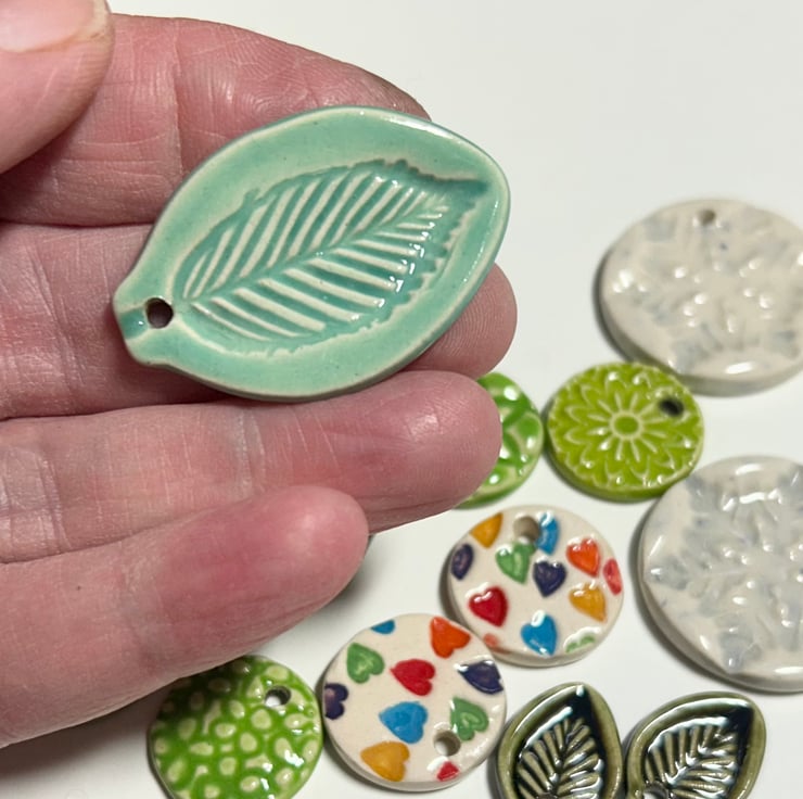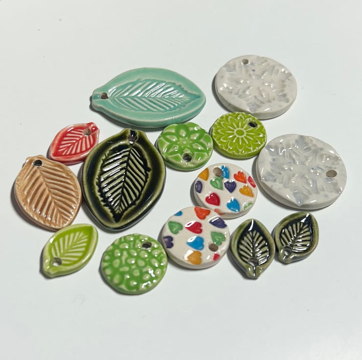Special price as they are discontinued stock. These ceramic beads are made from white earthenware clay and imprinted with pattern. Glazed on both sides. One hole at the top. The ceramic beads are assorted sizes but most are approx 2cm. There are three matching pairs of beads, the rest are singular.