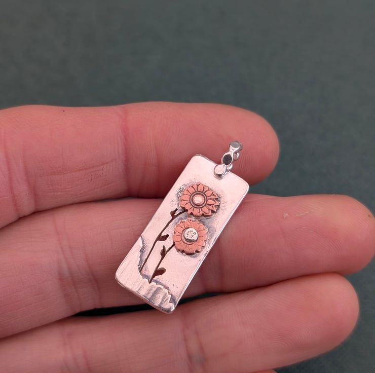 A pair of copper sunflowers swaying on a sterling silver pendant.