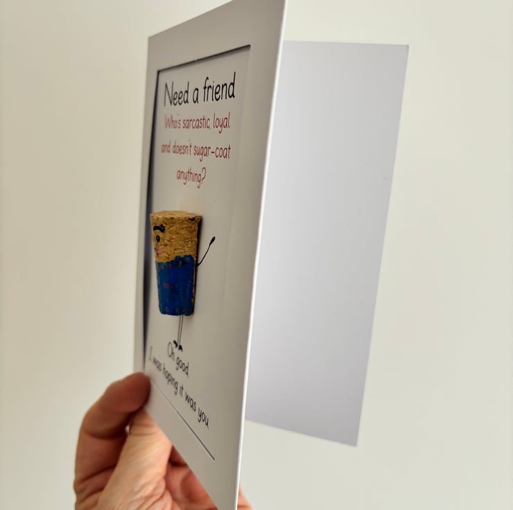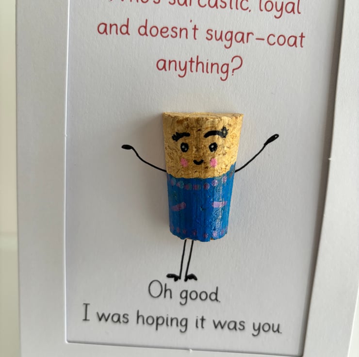 A playful and light-hearted handmade birthday card featuring a hand-painted cork character with bold personality and charm.