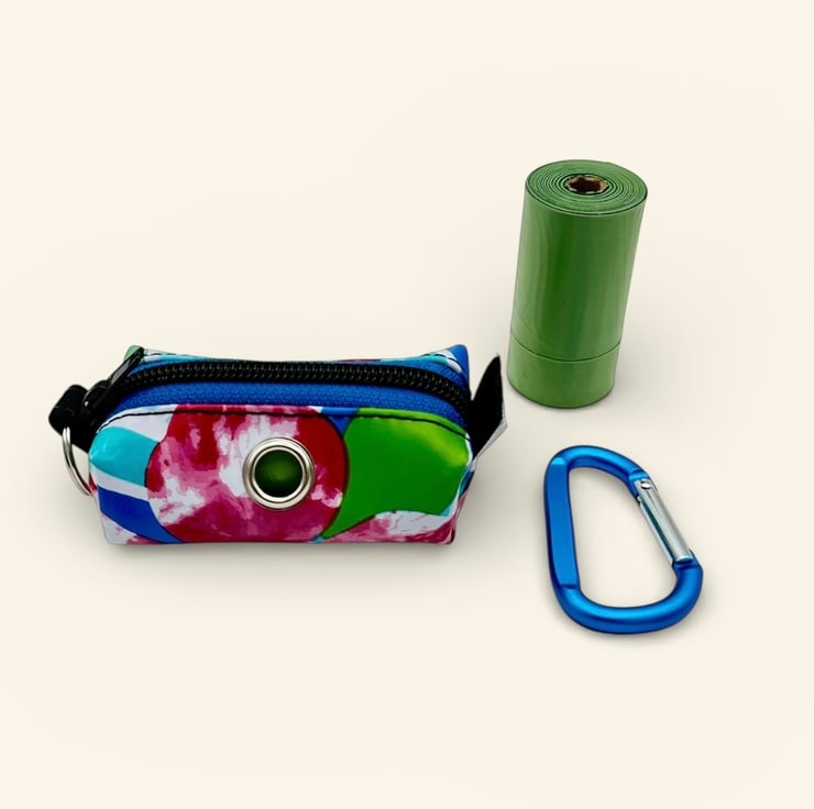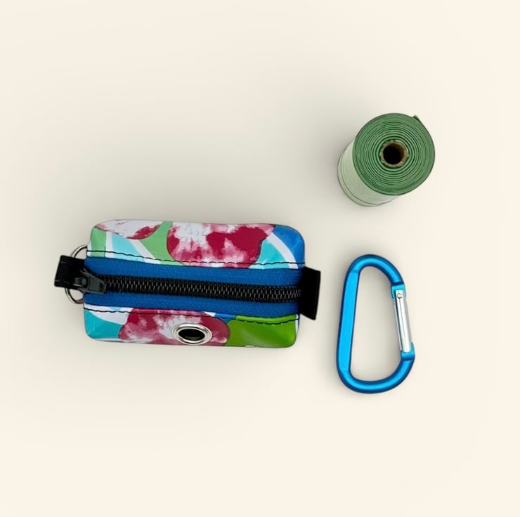 This dog poo bag holder is small, strong and weatherproof. It features an ‘auto lock’ zip, which is smooth to open and close but stops accidental unzipping. The bag is lined with scavenged canvas from a boat canopy. There is a metal opening for you to pull the bags through and a handy, sturdy karabiner clip.