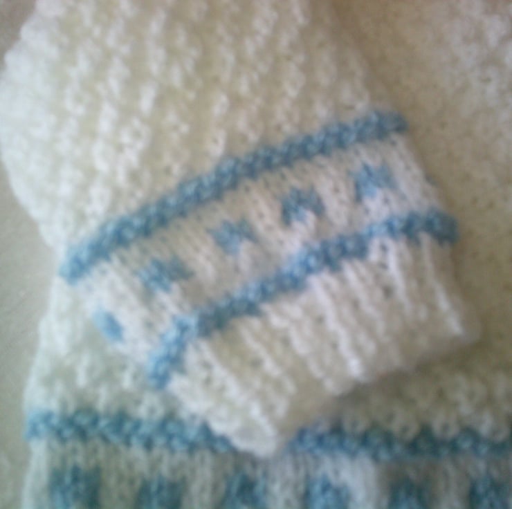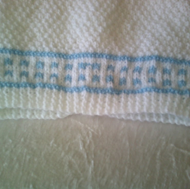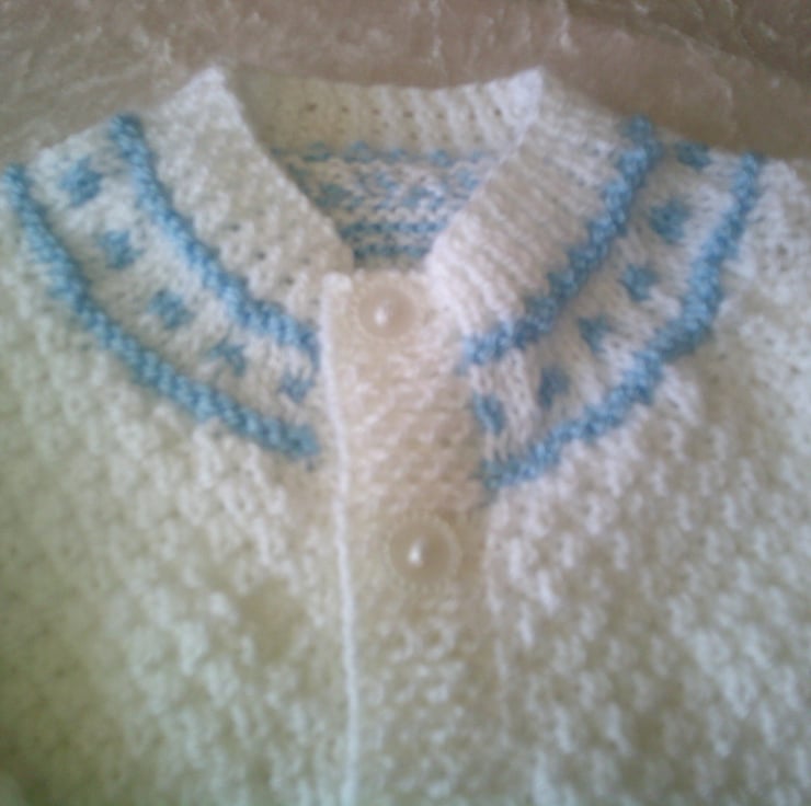 This hand knitted Round Neck cardigan is made using white and blue acrylic yarn in moss stitch and the blue yarn being used to make a contrasting border round the bottom of the fronts, sleeves and the neck. It would make a lovely addition to a babies wardrobe.