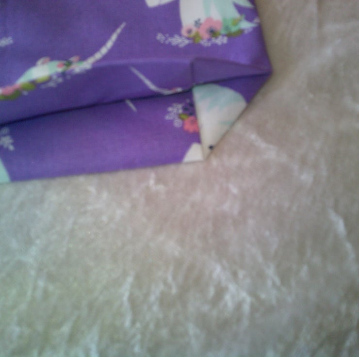 The fabric used has a design of Unicorn heads and flowers on mauve background.