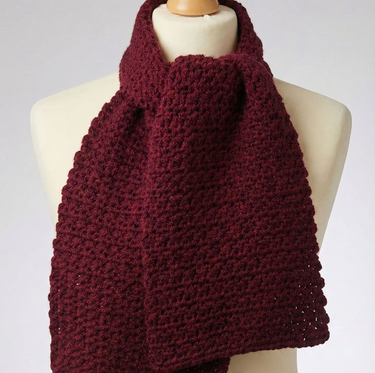 A really soft and gorgeous, short and narrow burgundy scarf. It would be ideal to wear with a favourite jumper for a little added warmth. The scarf measures approximately 46 inches (L) by 7 (W). Care guidance will be sent with your purchase and it will be wrapped in tissue paper.