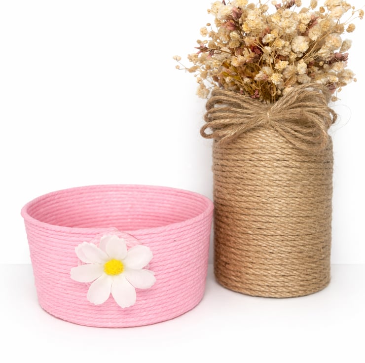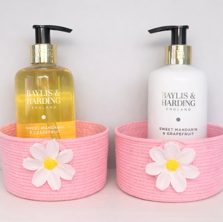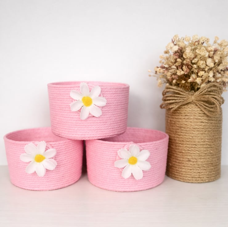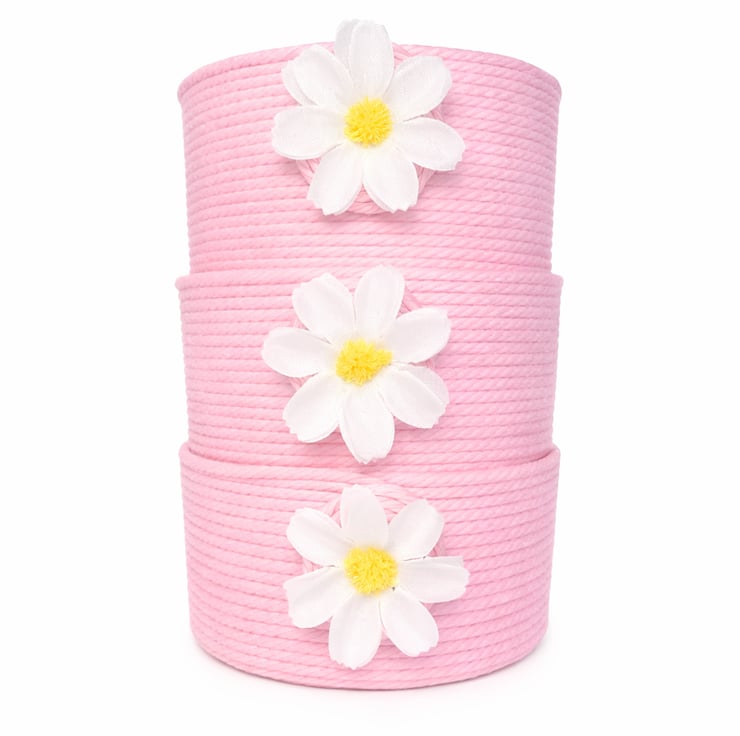 Add a touch of sweet rustic charm to your home with this handmade pink rope storage basket, finished with a delicate daisy detail.