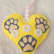 Pretty hand sewn felt heart decorated with bees and flowers gently padded with polyester fibre toy stuffing. Yellow ribbon and heart button attached to hang up anywhere in the home ready for Spring.