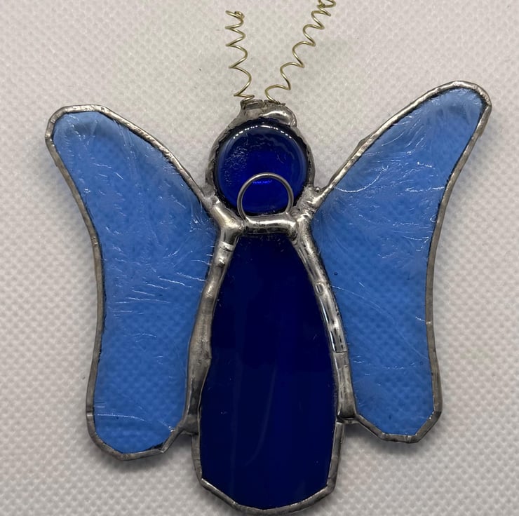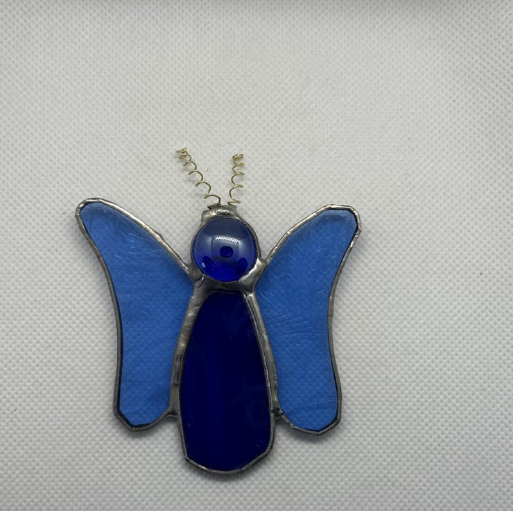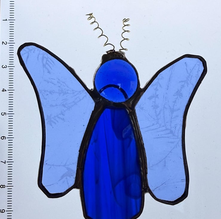 This listing is for one stained glass flutterby fairy with a wispy royal blue body and matching blue bluechip glass wings.