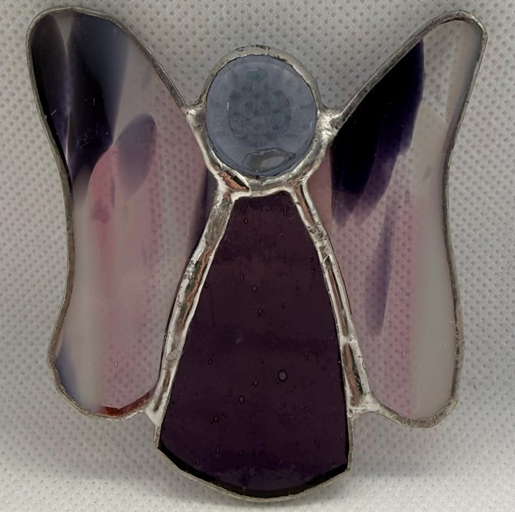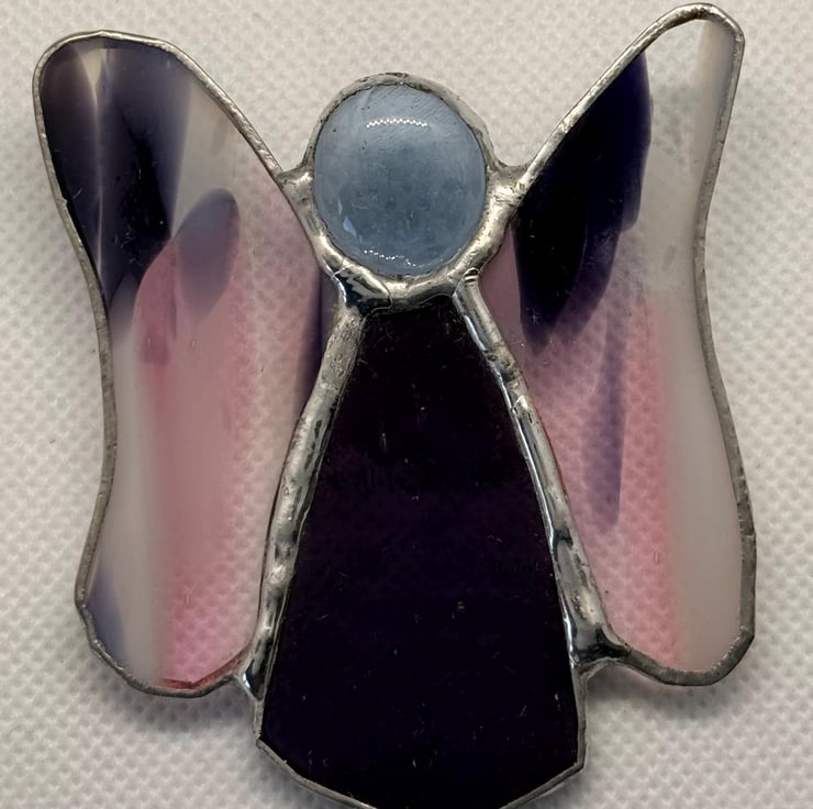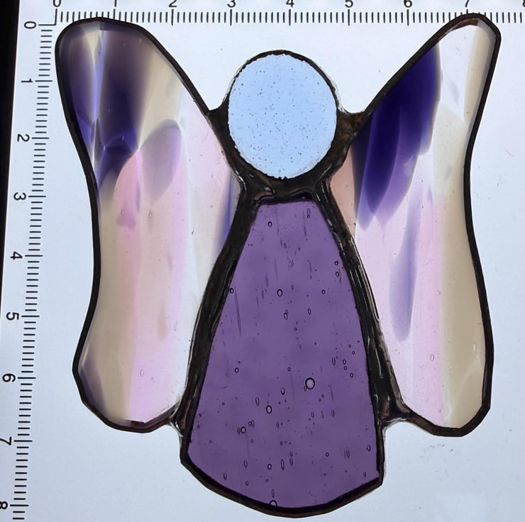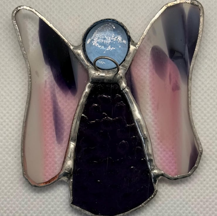 This stained glass flutterby fairy is a tiny burst of colour and light. Her body is made from rich purple glass, glowing warmly when the sun touches it. Her wings are crafted from multicoloured purple, pink, and white glass, where the colours overlap in soft, splodgy patterns; almost like watercolour pigments drifting into one another. Every shift of daylight reveals a new blend of tones, giving her wings a lively, everchanging character.