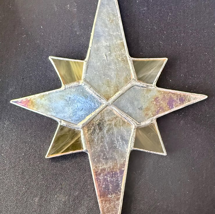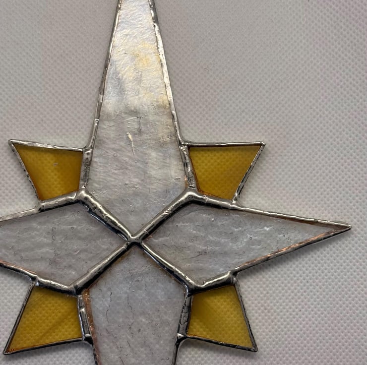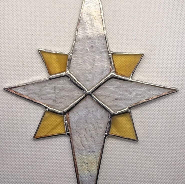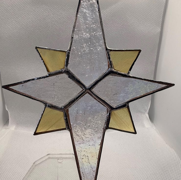 This listing is for one stained glass Bethlehem star. This one has clear irridised textured hammered clear glass for the four main points and a streaky pale yellow glass for the quarters. There are other colour combinations on offer in other listings. Each has a hook for hanging from your Christmas tree garland or in the window as a suncatcher.