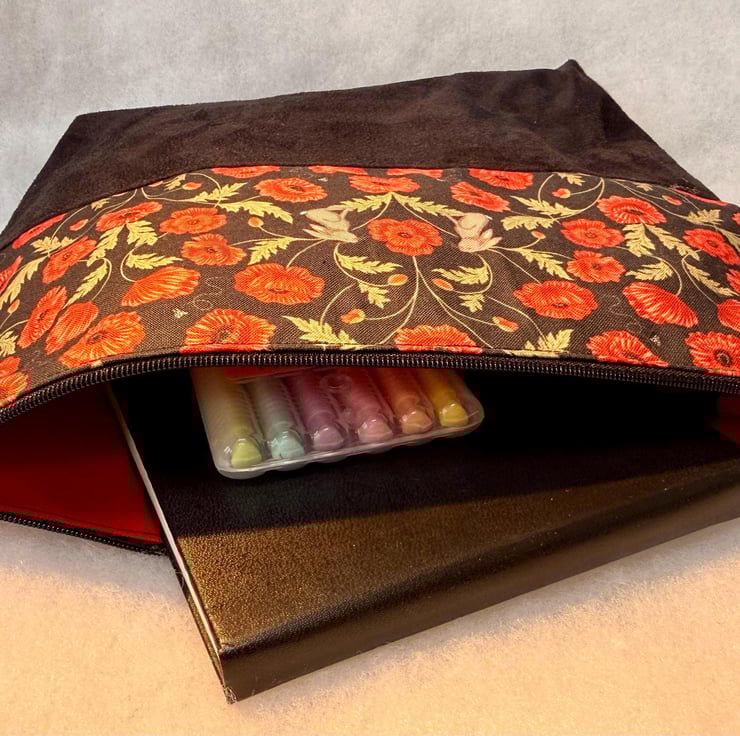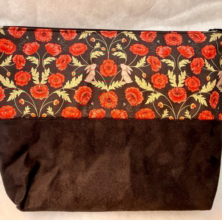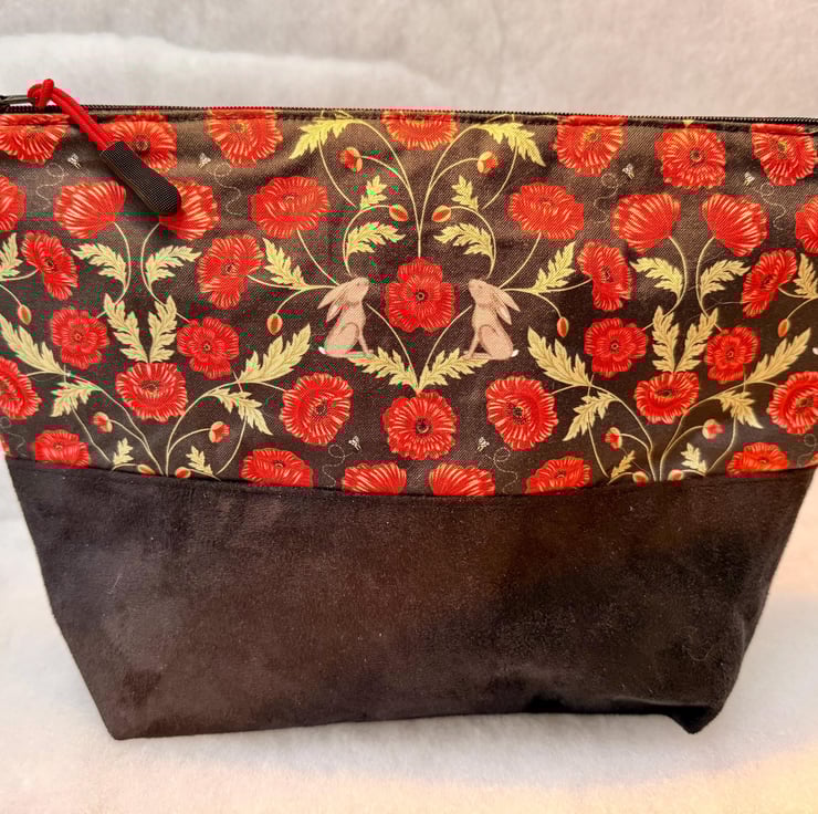 The pouch is machine sewn with the external comprising a cotton fabric highlighting brown hares amidst red poppies and green leaves on a black background at the top (if you look closely there are also small bees hidden in the design), and black soft-to-the-touch, suede for the base. The scarlet red lining is water-resistant. The pouch is closed with a black easy-glide nylon zipper and scarlet red and black zip pull.