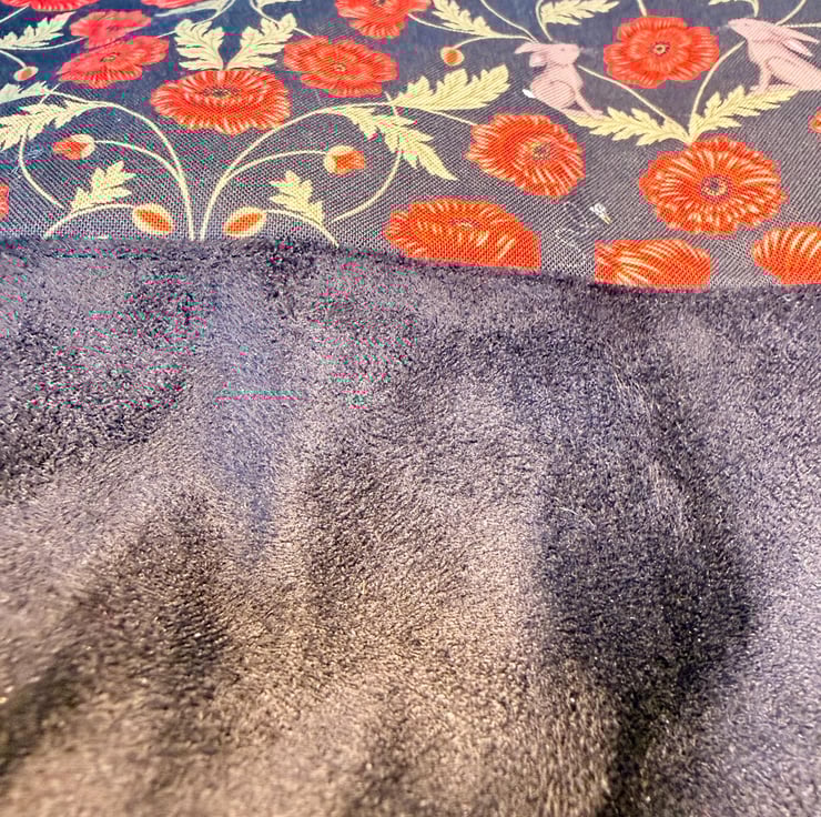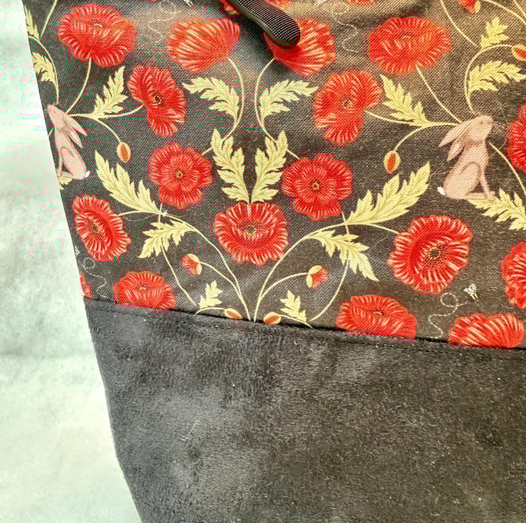 This subtle fabric of hares in poppies is stunning and sits beautifully with the black suede. I loved it and it makes a luxury bag with so many potential uses.