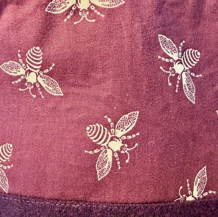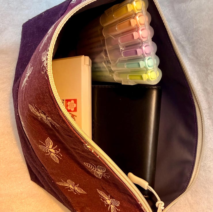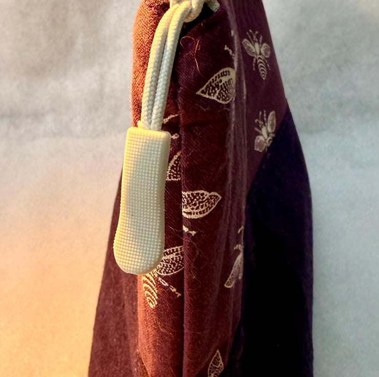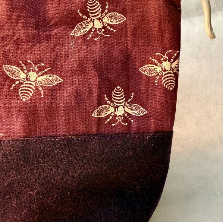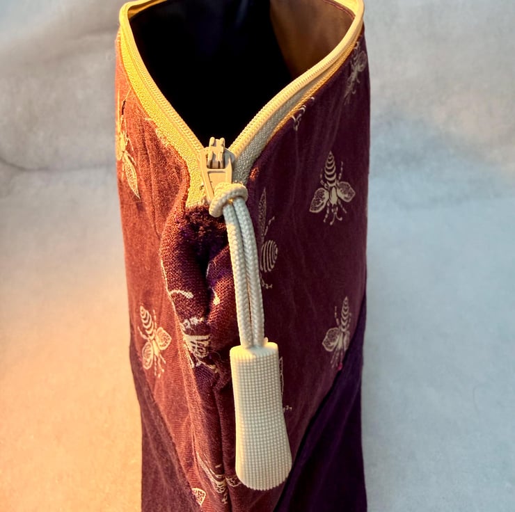 The pouch is machine sewn with the external comprising a cotton fabric highlighting honey bees in white on a purple-ish at the top, and dark purple soft-to-the-touch, boiled wool for the base. The navy blue lining is water-resistant. The pouch is closed with a beige easy-glide nylon zipper and pale grey zip pull.