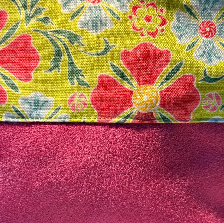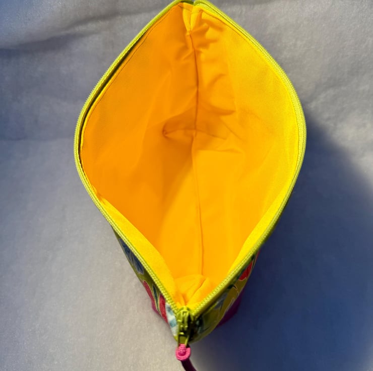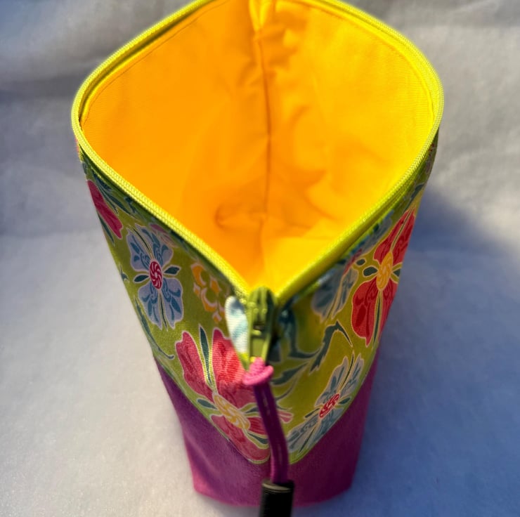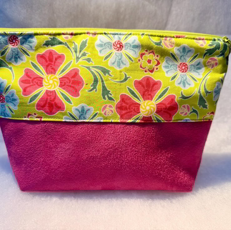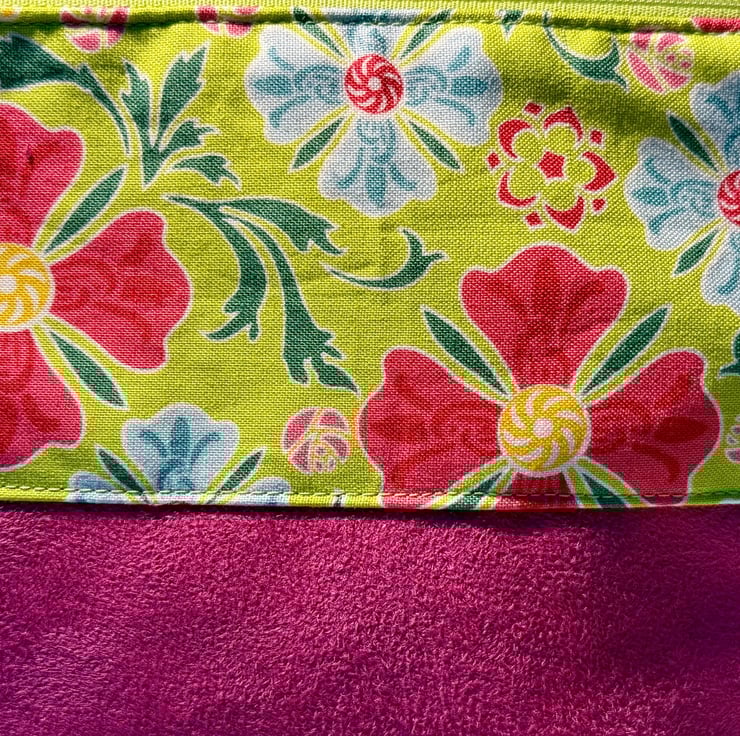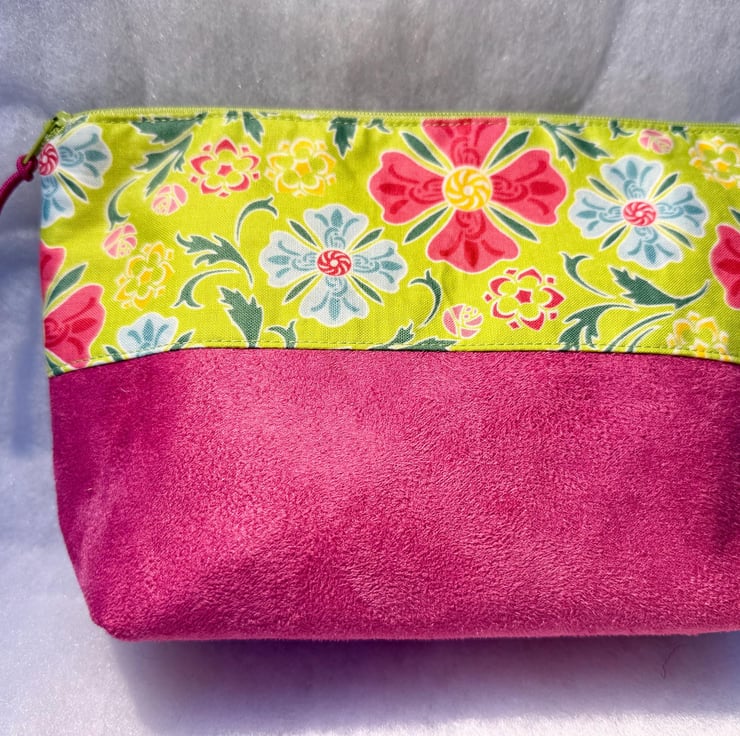 The pouch is machine sewn with the external comprising a cotton fabric of abstract pink and blue flowers on a lime green background at the top, and soft-to-the-touch vibrant fuchsia pink suede for the base. The sunshine yellow lining is water-resistant. The pouch is closed with a lime green easy-glide nylon zipper and pink and black zip pull.