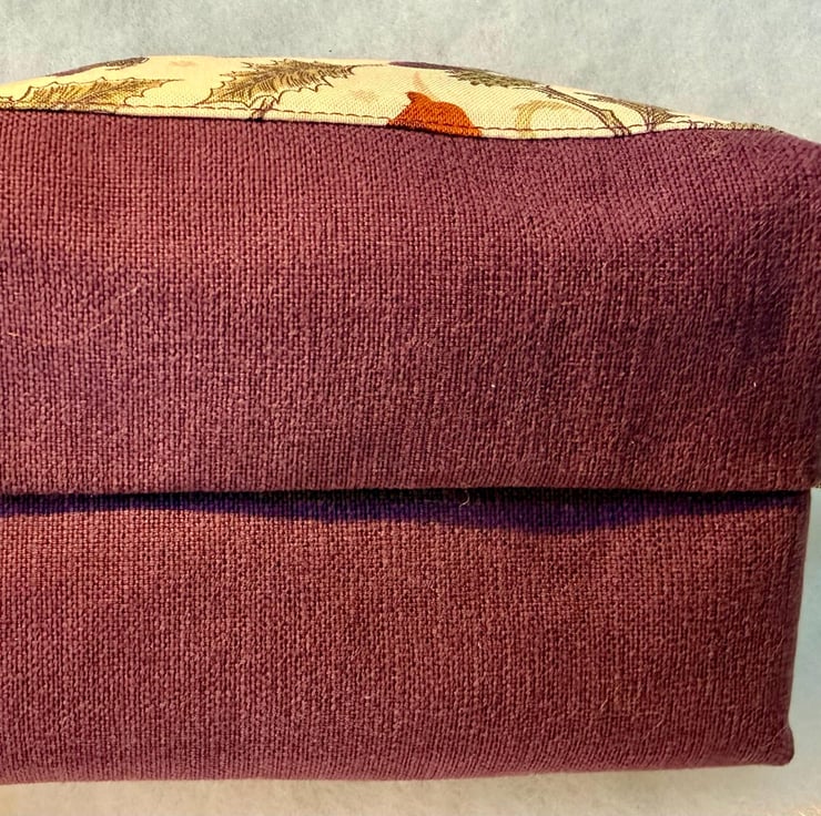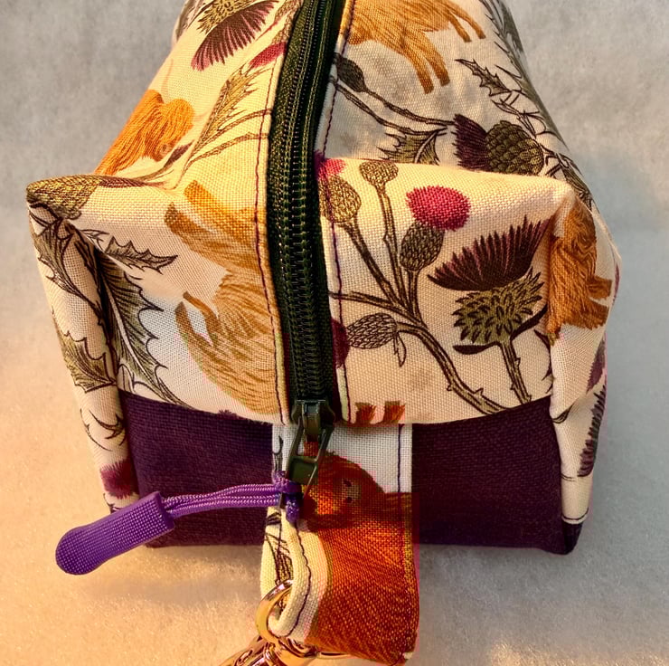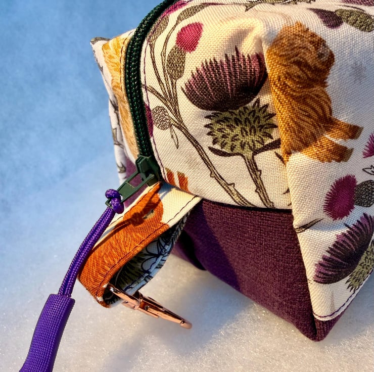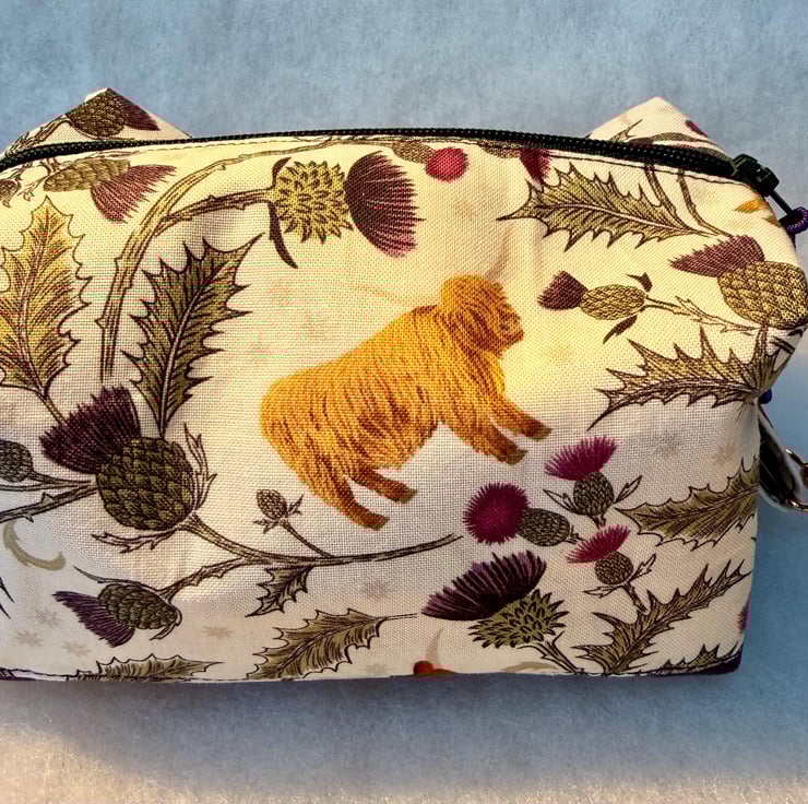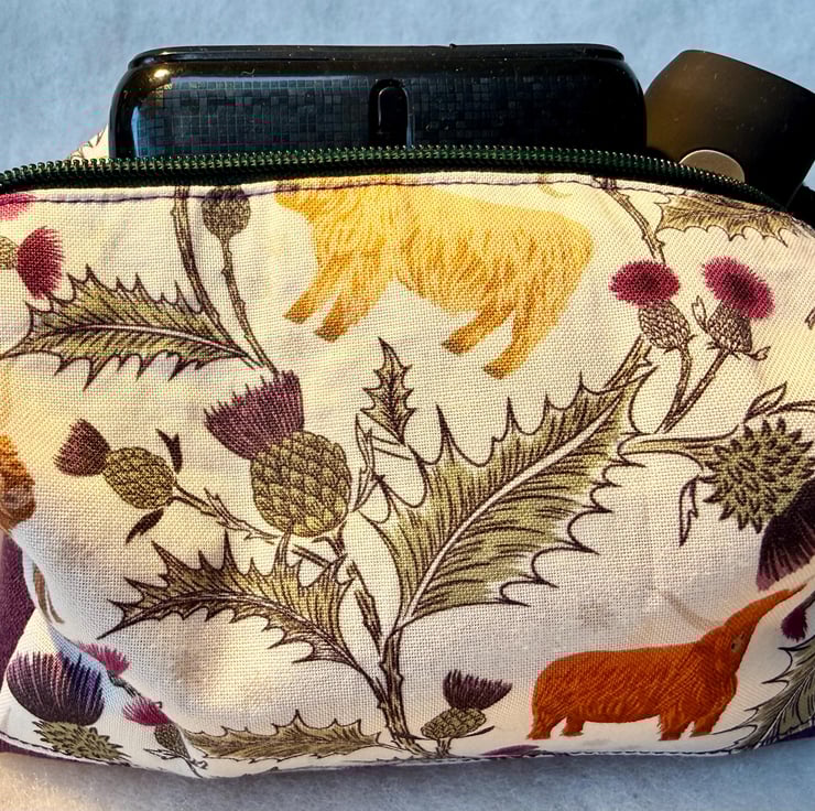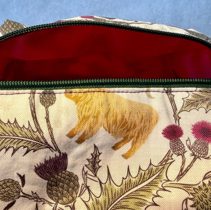 The pouch is machine sewn with an external Highland coo and thistle cotton fabric at the top and thistle-purple coloured soft-to-the-touch brushed cotton for the base. The vibrant fuchsia pink lining is water-resistant with bound seams. The pouch is closed with an easy-glide dark green nylon zipper and purple zip pull. One end has a tab and clip.