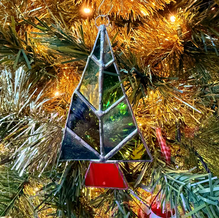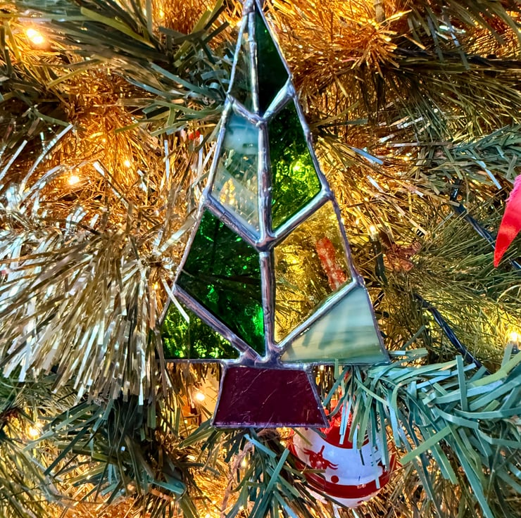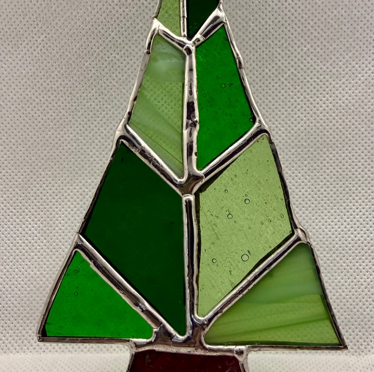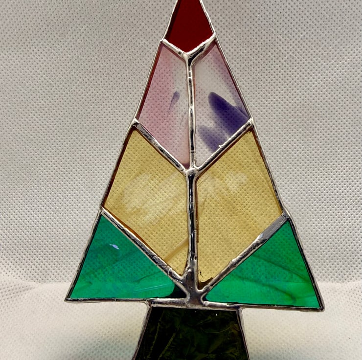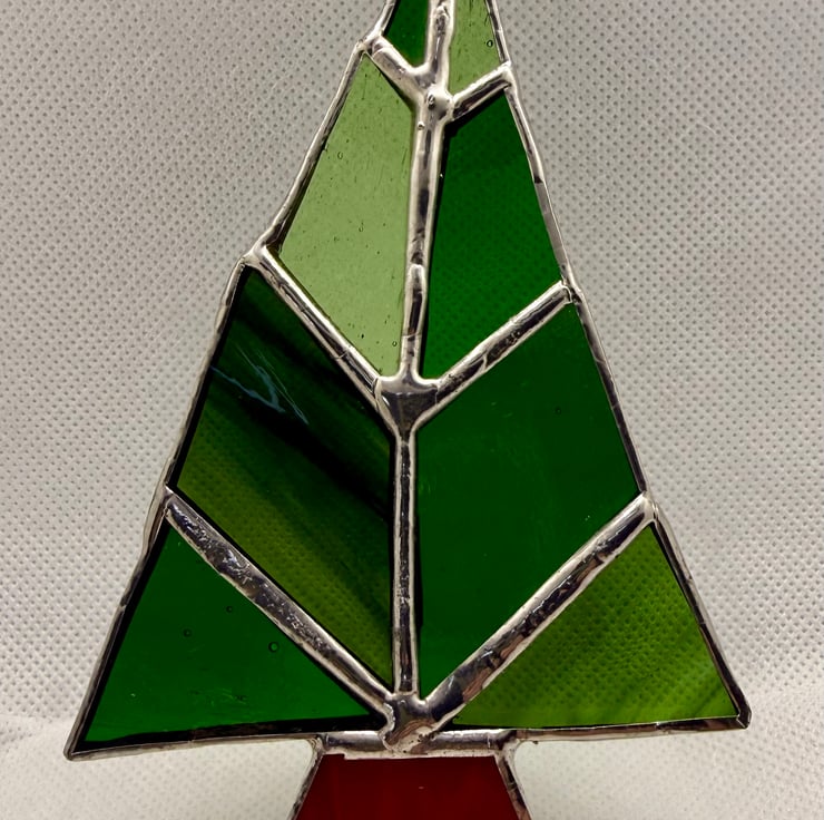 This listing is for one stained glass Christmas tree (medium, with eight panels), handmade using the traditional Tiffany foiled glass method. Each section of glass is individually cut, edged with copper foil, soldered, and cleaned.