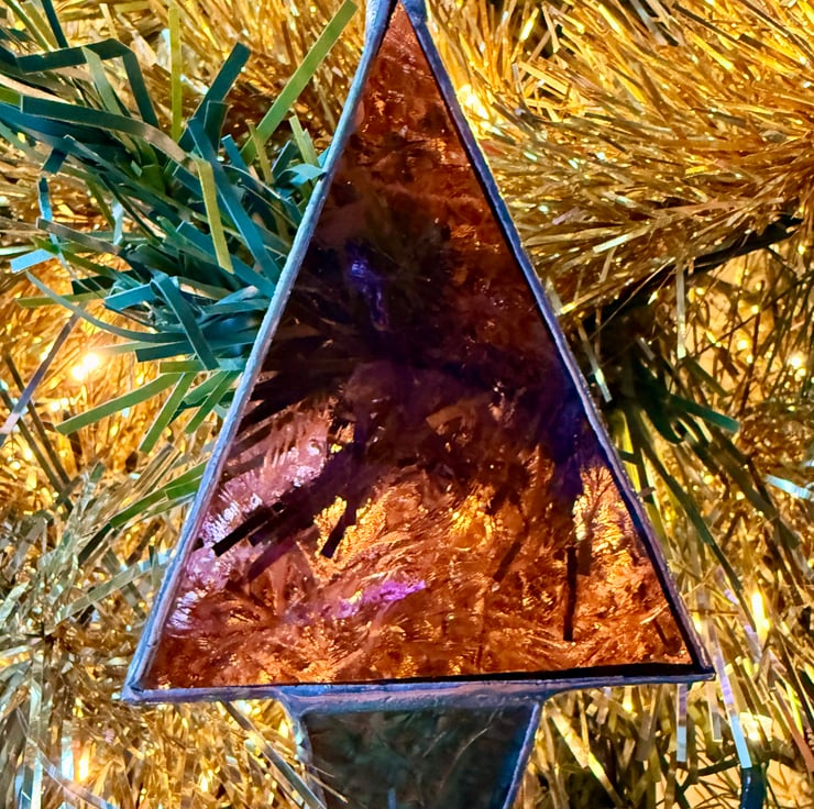 Every piece of glass is hand cut, edged with copper foil, soldered, and cleaned. A small hook is attached at the top so the tree can be hung from your Christmas tree, added to a festive garland, or displayed in a window as a cheerful winter suncatcher.