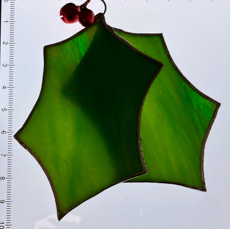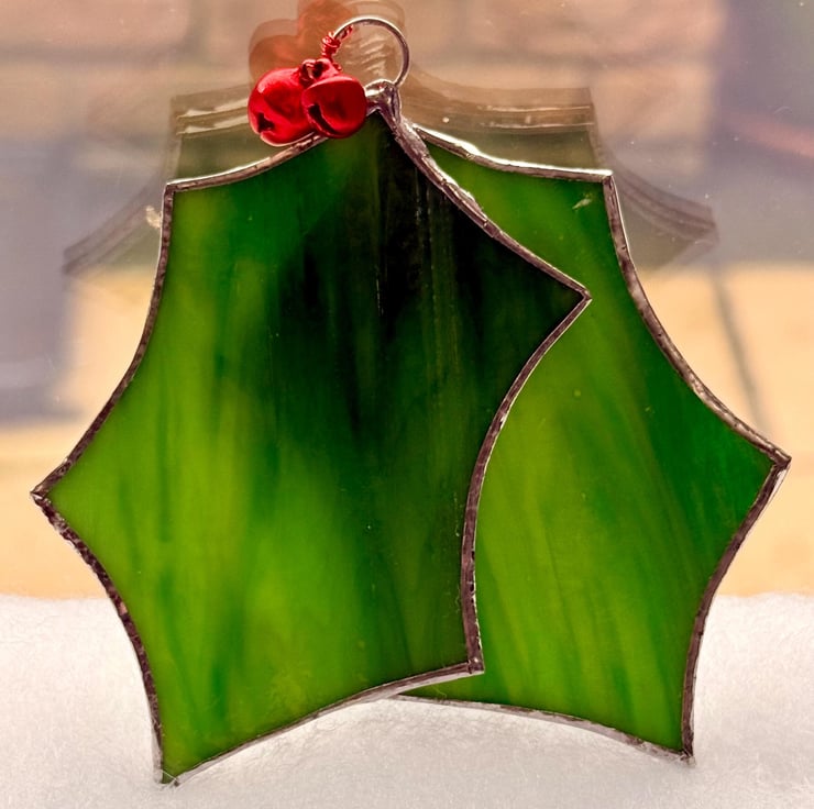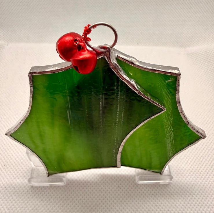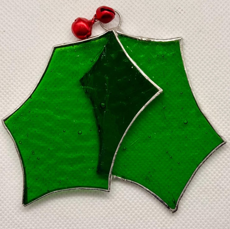 This listing is for one stained glass pair of holly leaves with two attached red jingle bells.