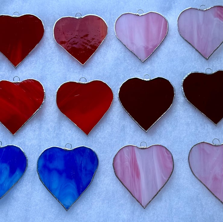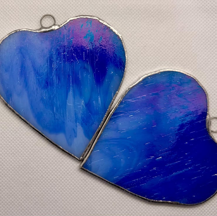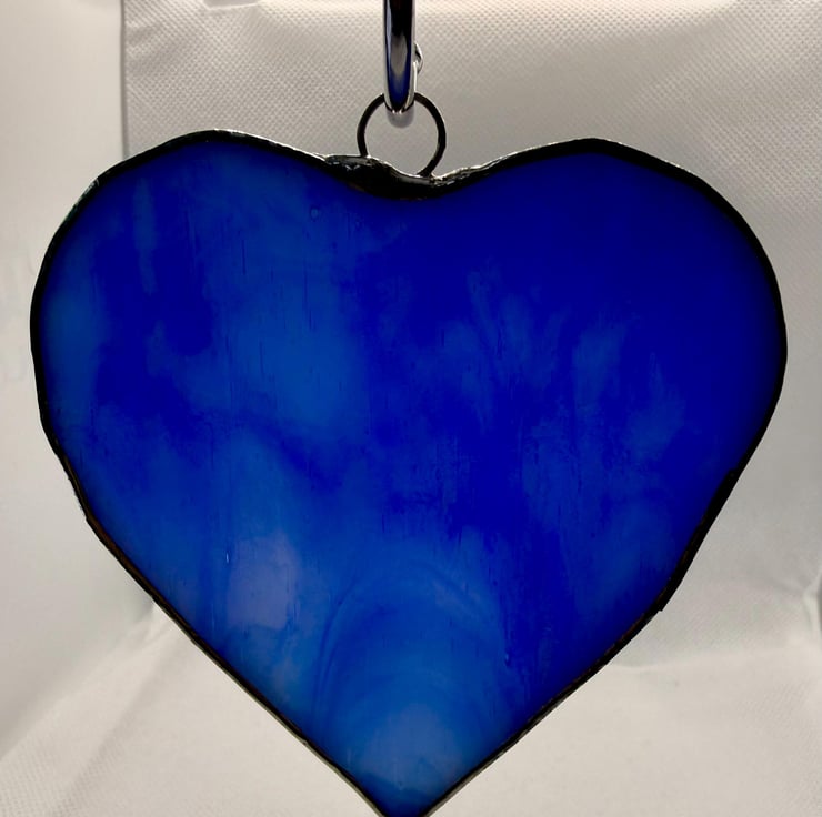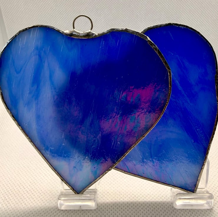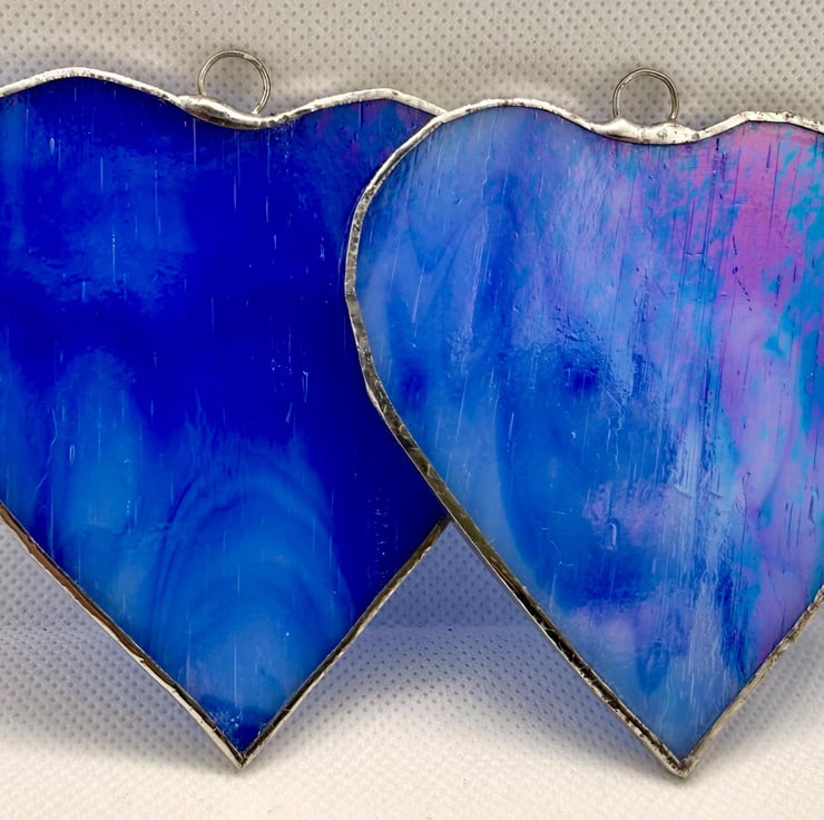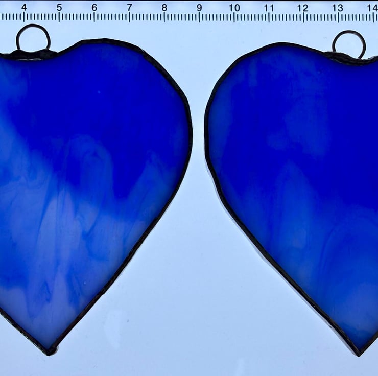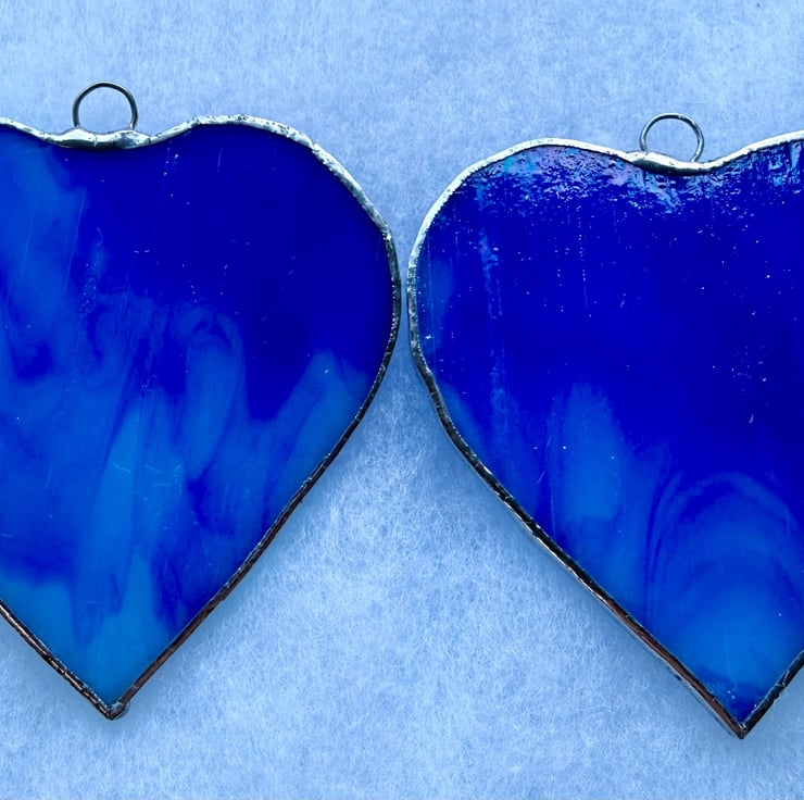 This listing is for a pair of stained glass medium sized hearts cut from a richly coloured royal blue glass. The glass is not fully opaque allowing strong light to tramsit through the streaky areas.