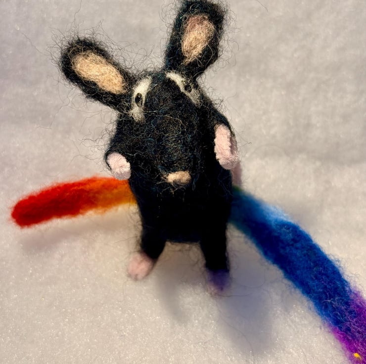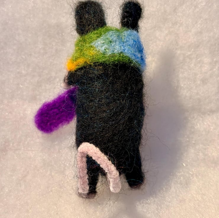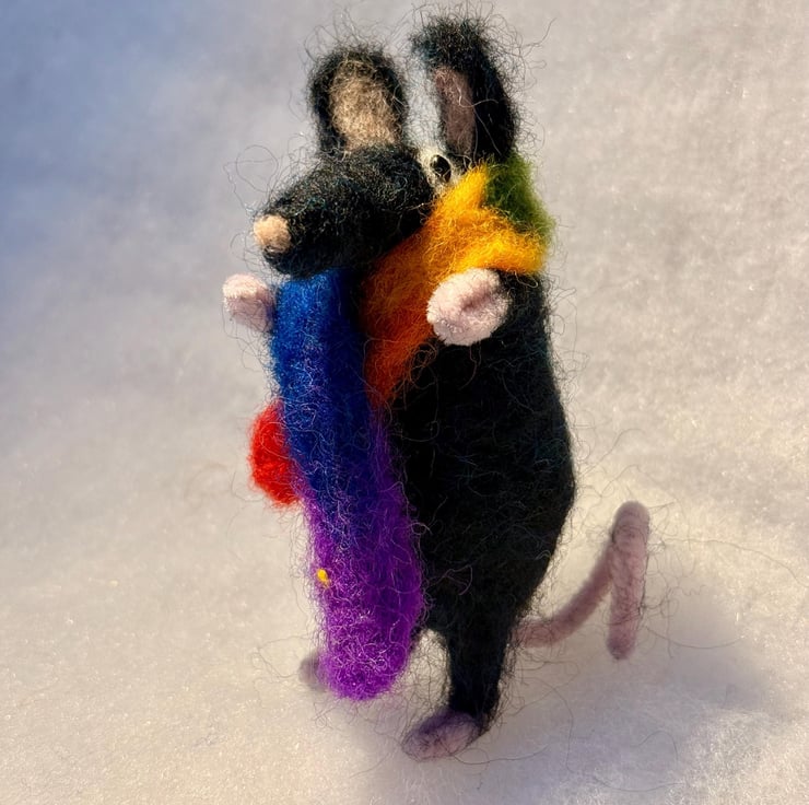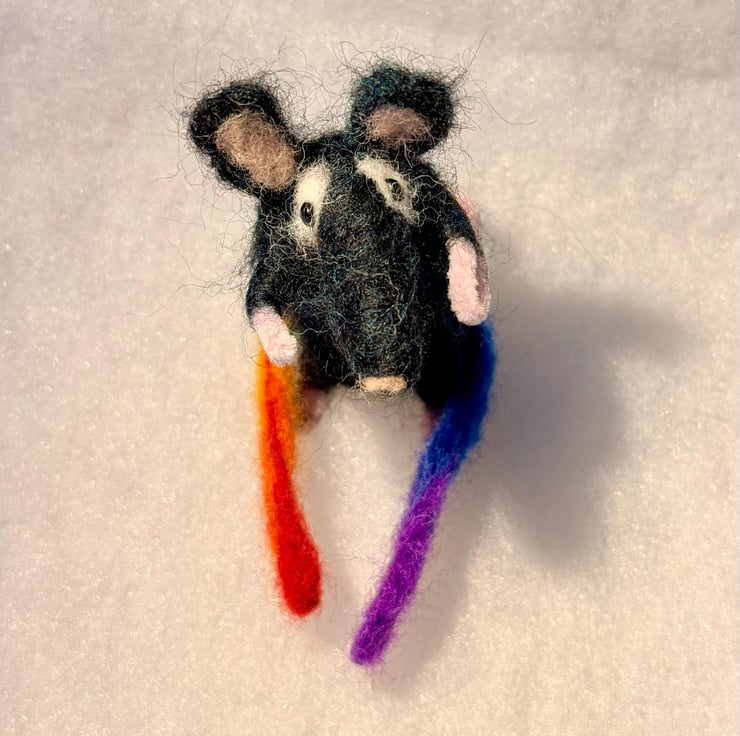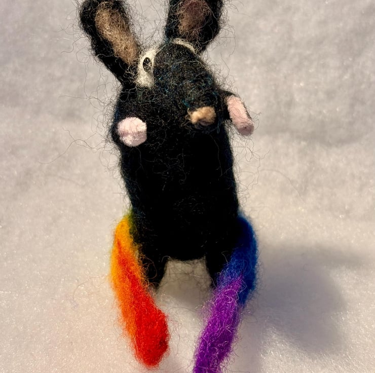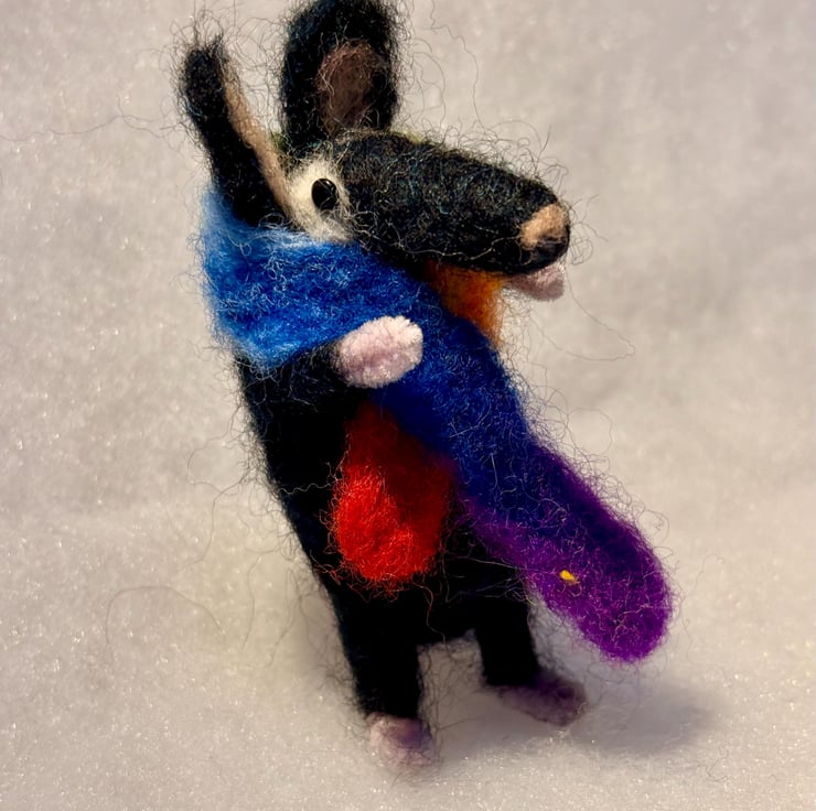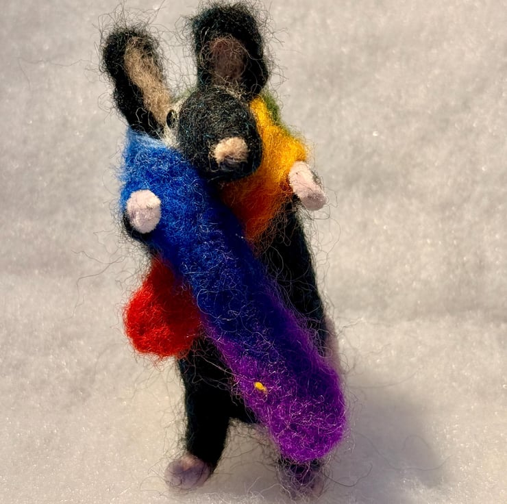 This listing is for one hand felted mouse (black with white eye patches keeping warm with rainbow scarf.