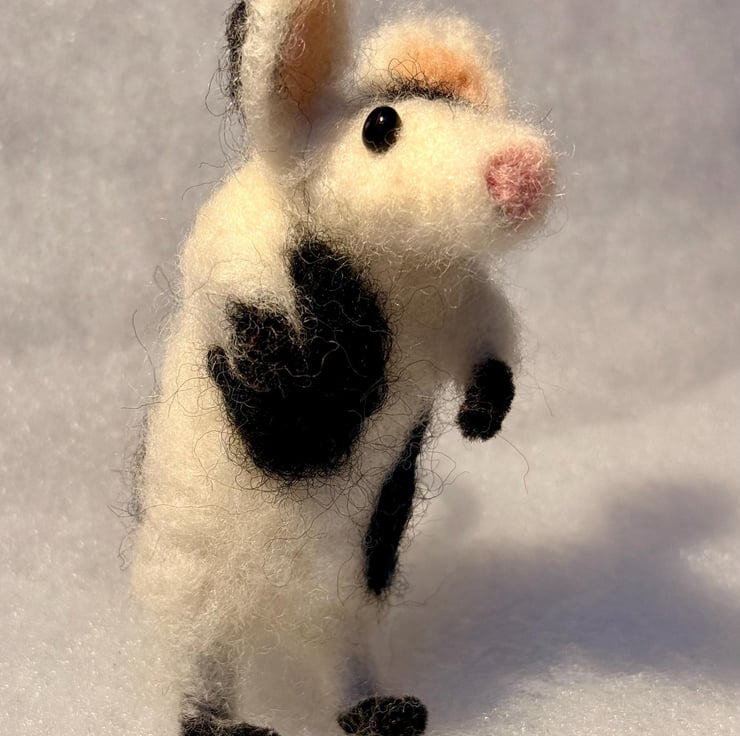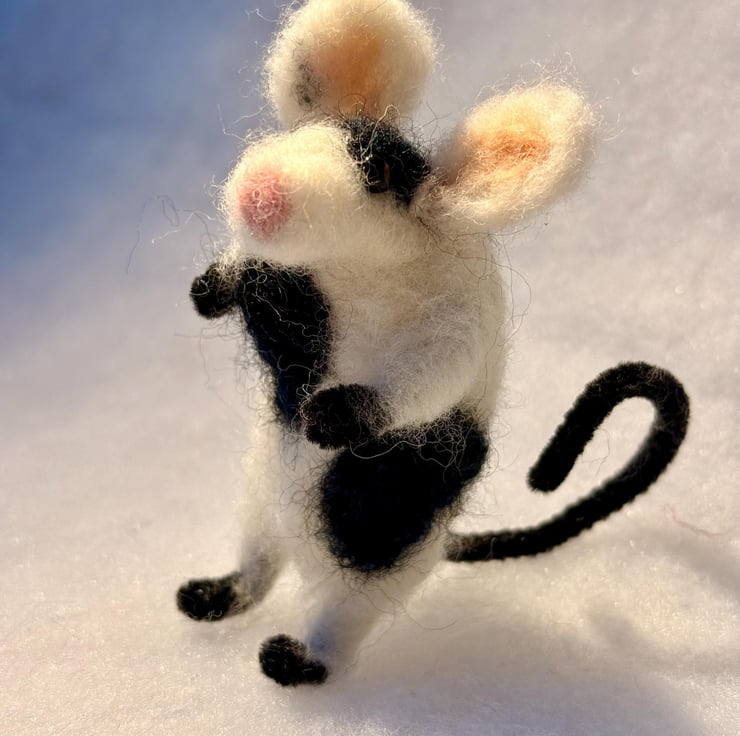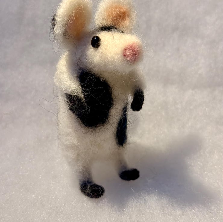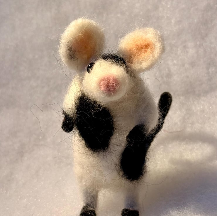 This listing is for one hand felted mouse (piebald black and white - super cute).