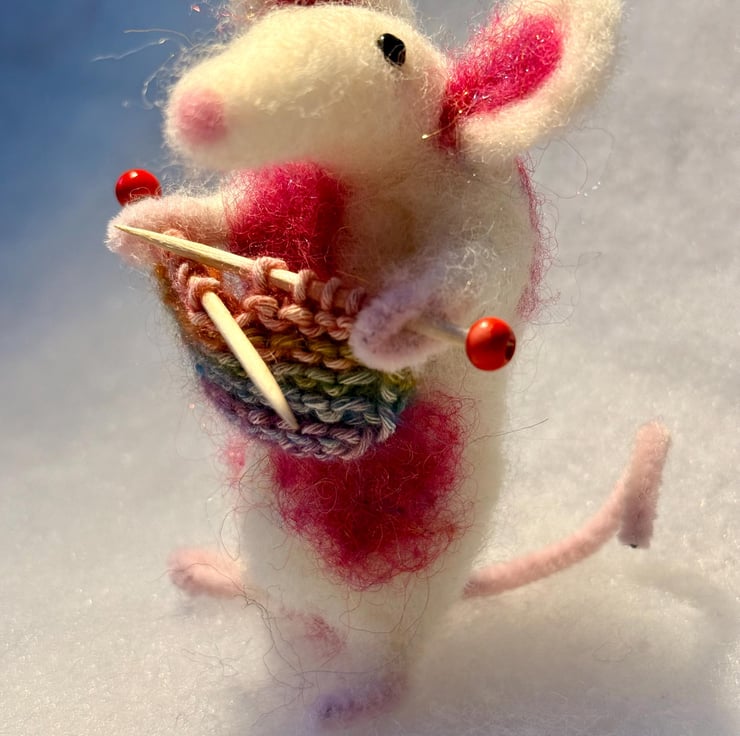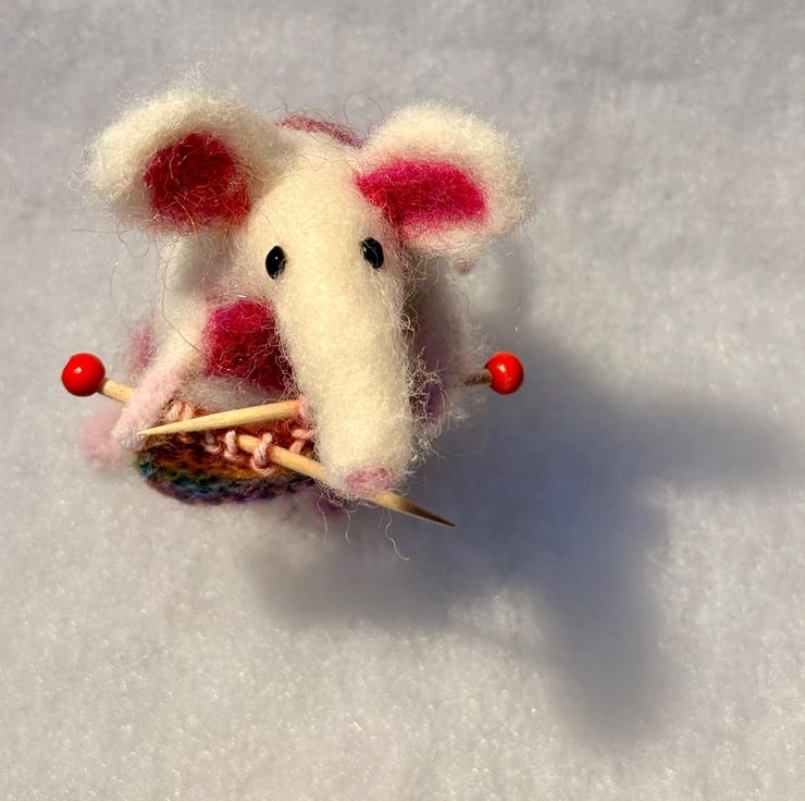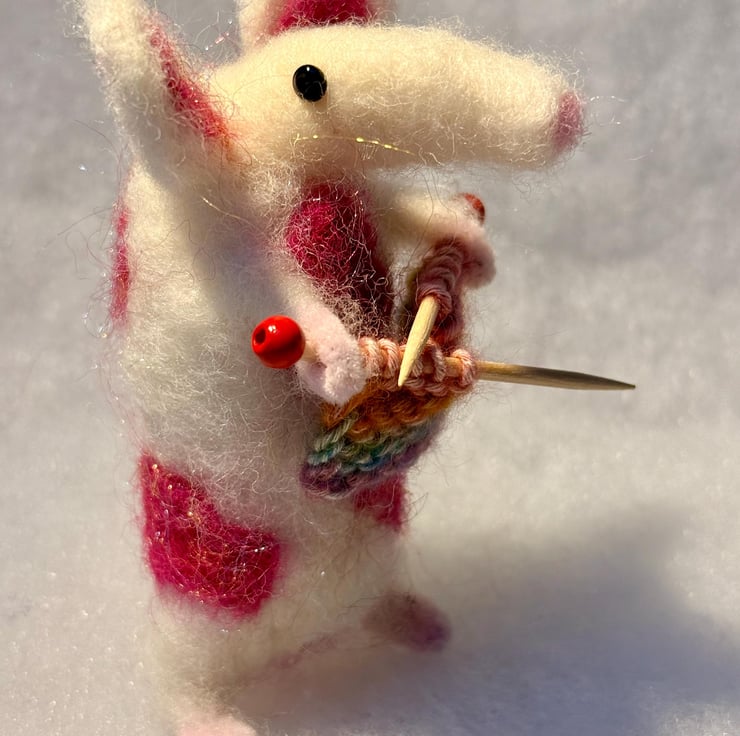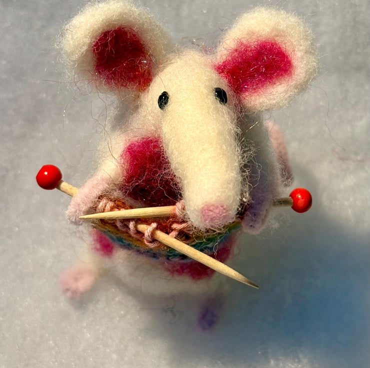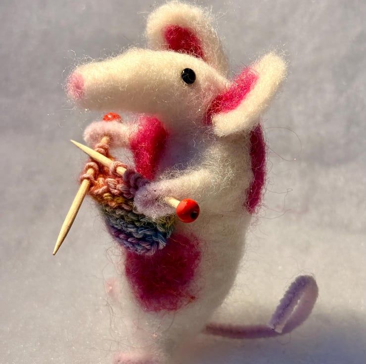 This listing is for one hand felted mouse (white with pink patches, happily knitting).