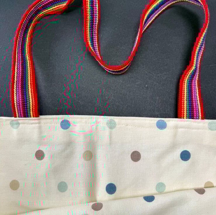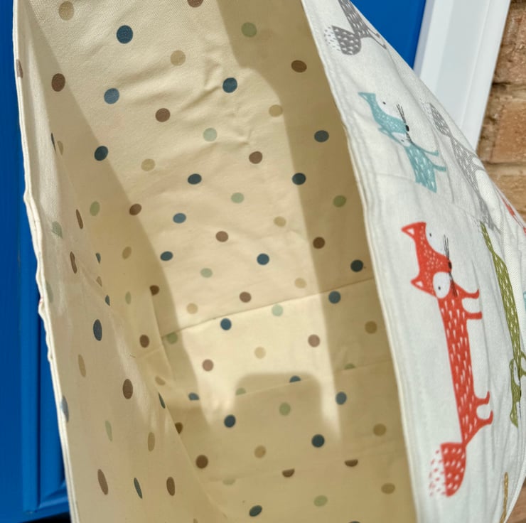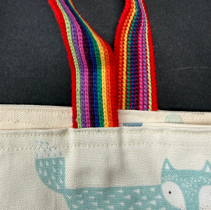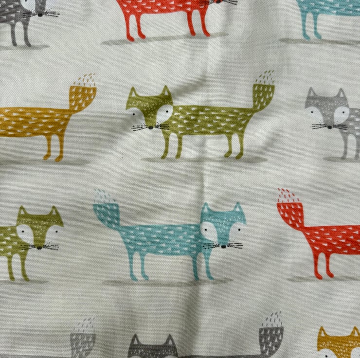 This tote began with the fabric itself — a scatter of foxes in different colours, each one mid‑pause, full of quiet mischief. The cream background reminded me of soft woodland light, the kind that filters through trees on a warm morning. I paired it with rainbow webbing handles to echo the playful spirit of the print and to bring a little unexpected joy to an everyday carry‑all.