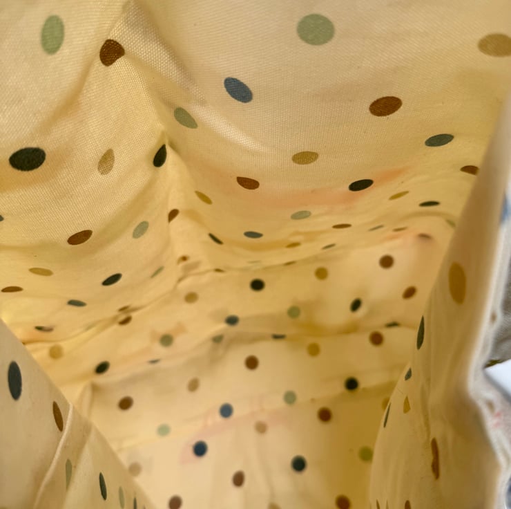 I chose a tough cotton canvas for the outer so the bag feels sturdy and dependable, and lined it with vibrant cotton to add a hidden flash of colour inside — a small secret brightness for the person carrying it. Every stitch is intended to make the bag both practical and cheerful, something that can be used daily but still feels special each time it’s picked up.