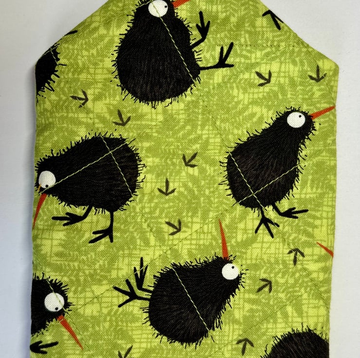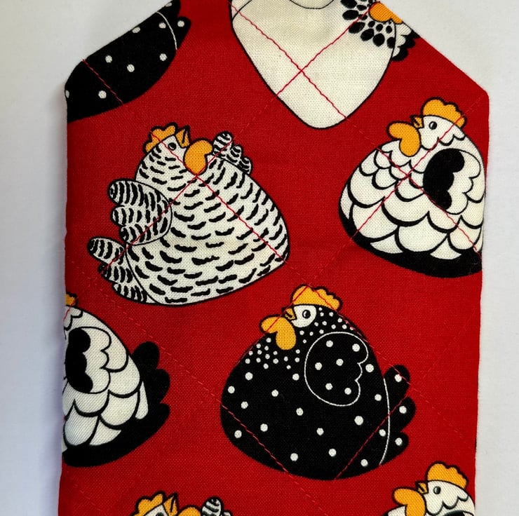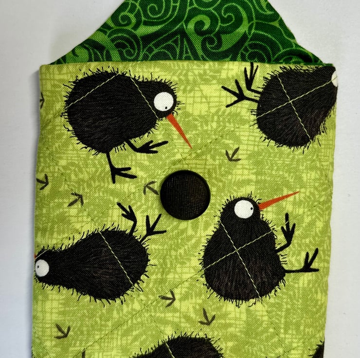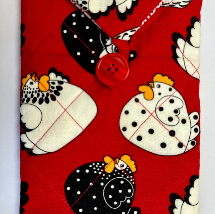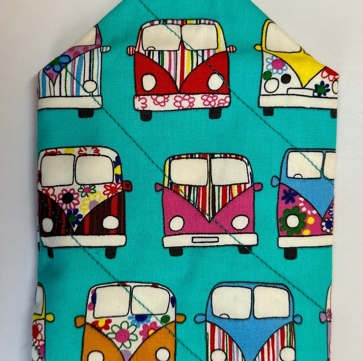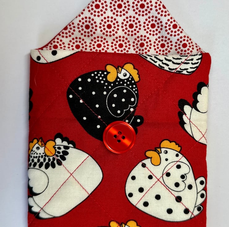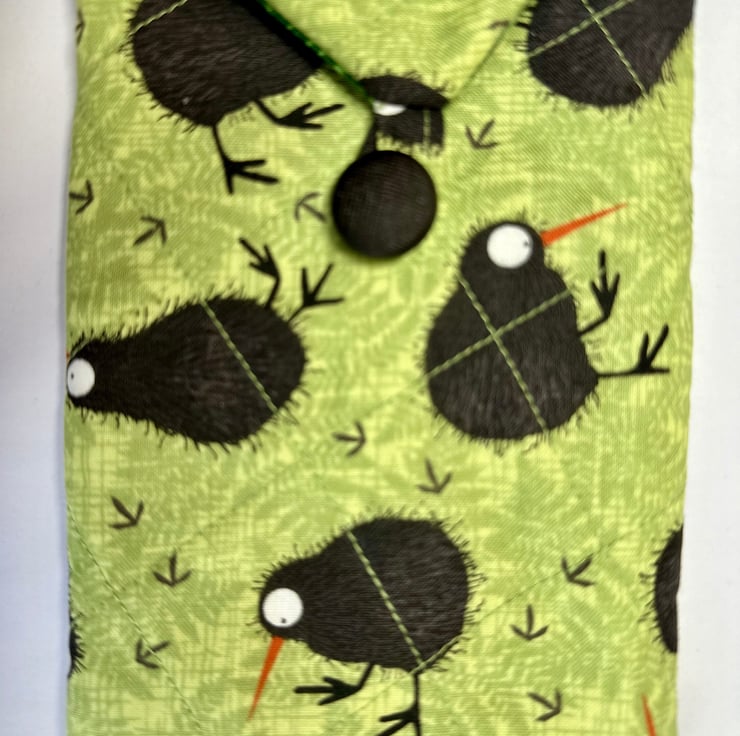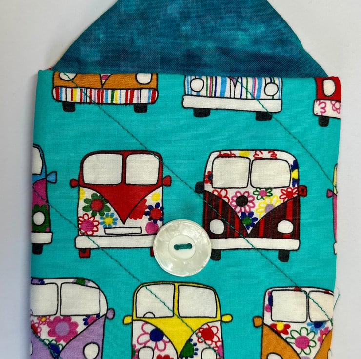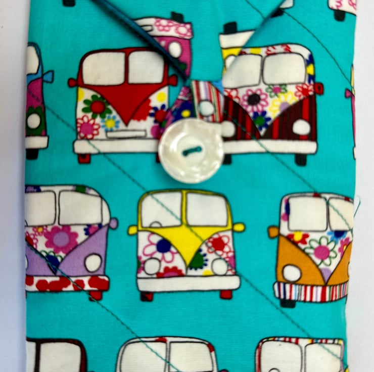 The pouch is padded and quilted for softness and protection, and machine sewn from cotton fabric in a variety of colours and patterns (please see other listings for the full range). It closes with a single loop and button, giving it a simple, secure finish. The fabric is not waterproof, so the pouch is best suited for indoor use or for items that don’t require moisture protection.