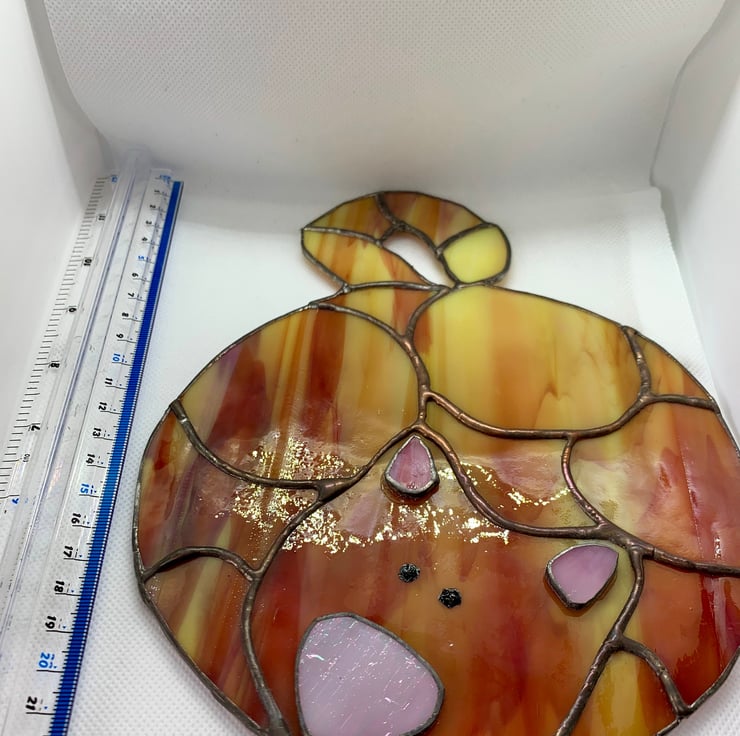 The finished item measures approximately 23 cm high by 17 cm wide. The cat can be hung by his tail or placed on a stand. The colours are most effectively displayed if lit from behind.